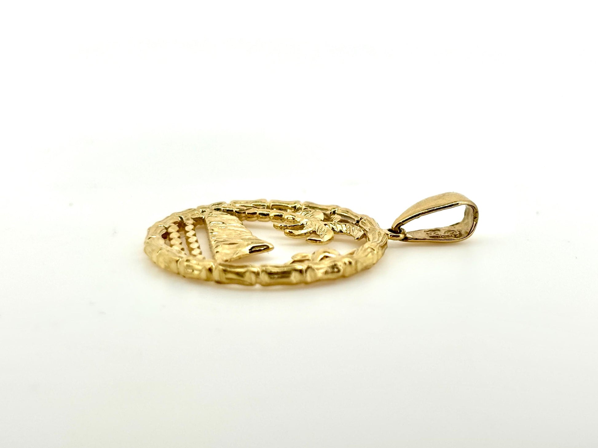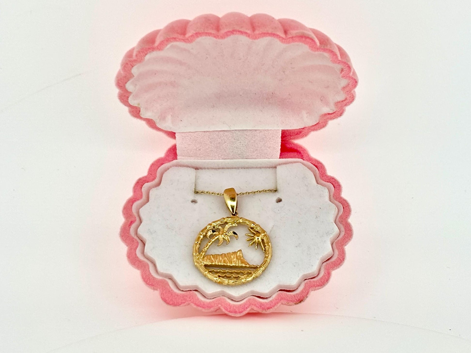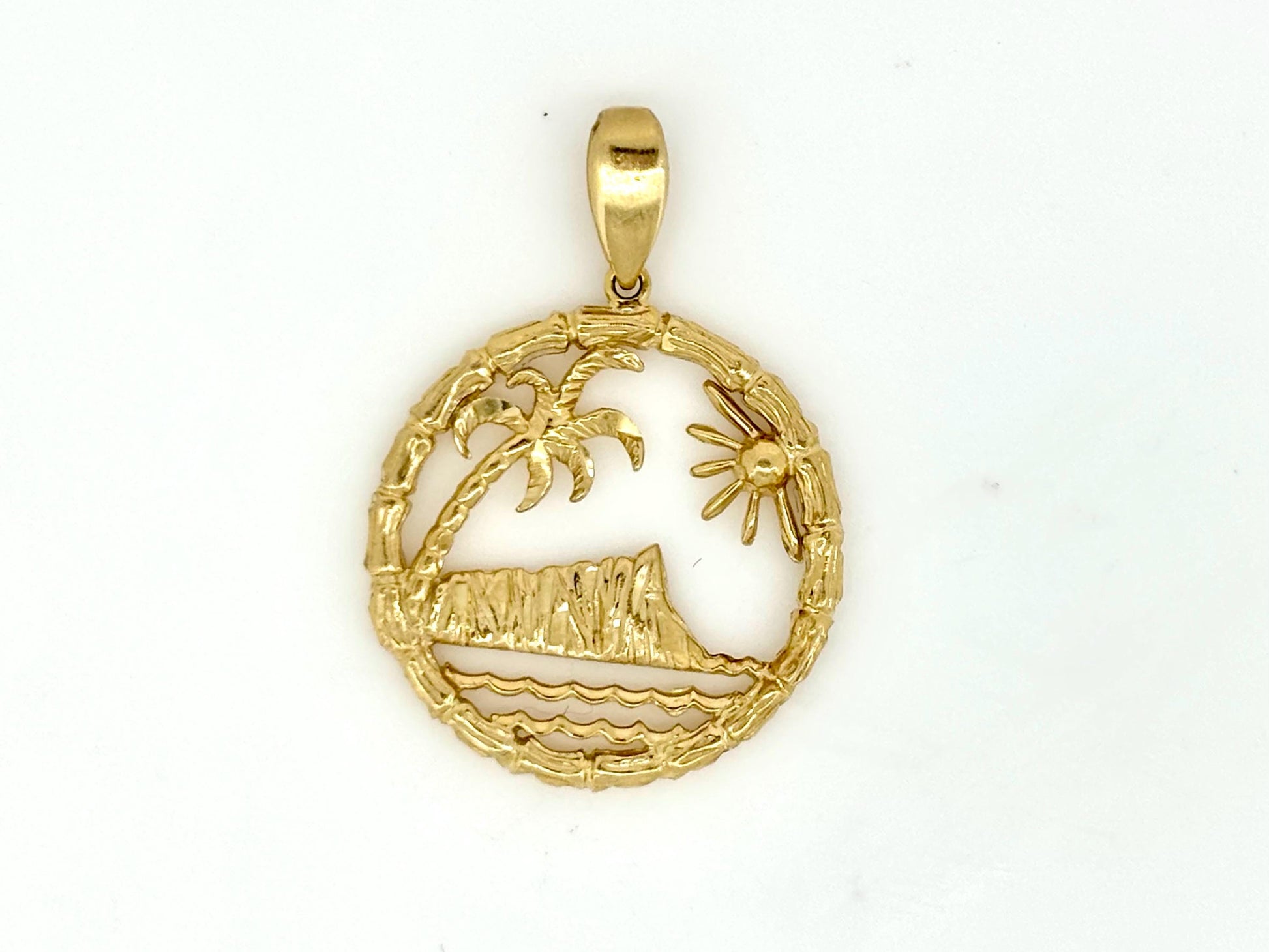 Design: Crafted in solid 14k yellow gold, this stunning pendant features an intricate Hawaiian beach scene — a reflection of island serenity and natural beauty.