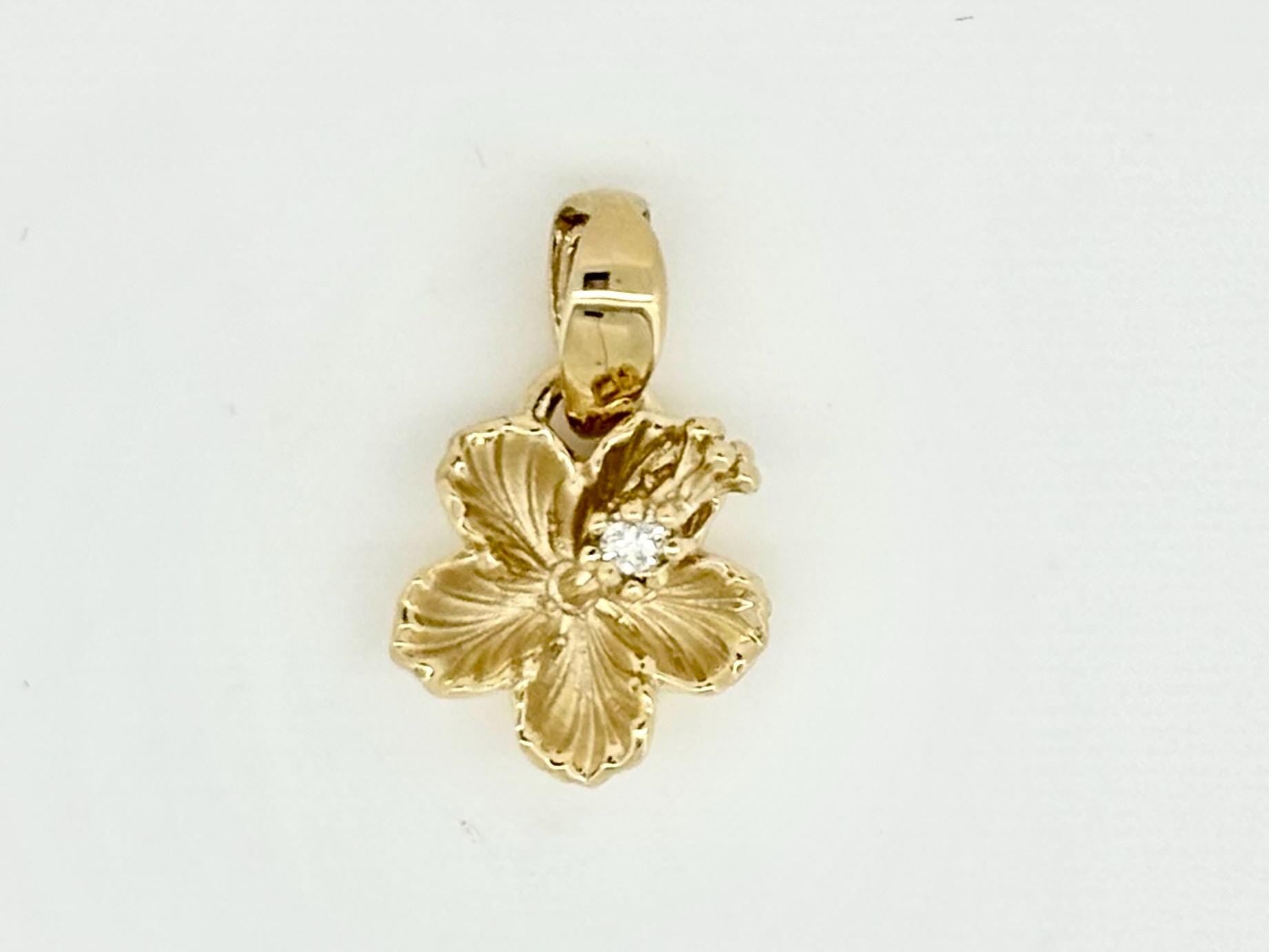 This beautiful 14K Solid Gold pendant width is approximately 0.39 inches (10 millimeters), height is approximately 0.59 inch (15 millimeters) with the bail, It has very beautiful hibiscus shape and 0.2 ct Diamond in the middle. Pendants weight is 1.06 gr.