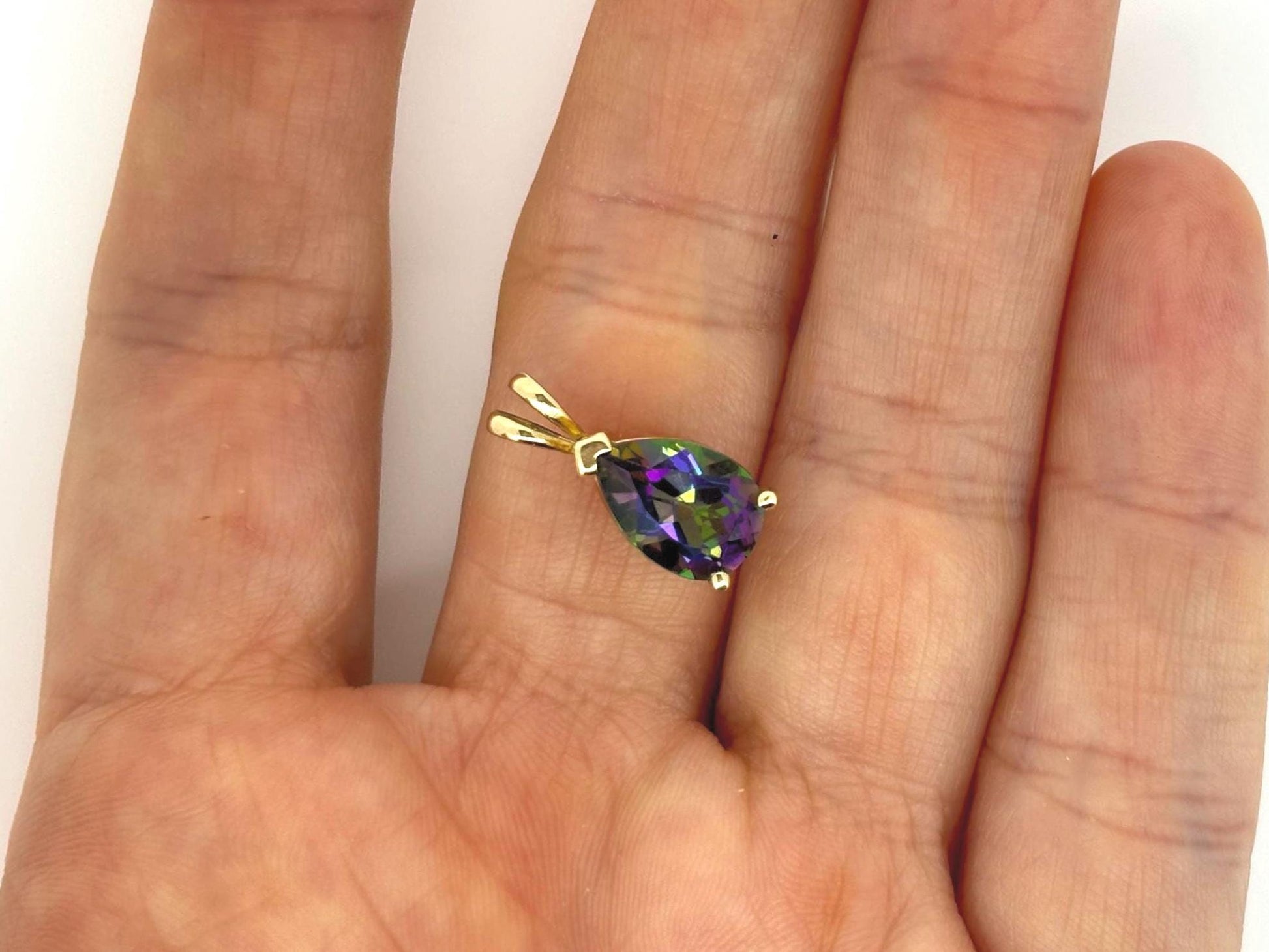 Design: Crafted in solid 14k yellow gold, this elegant pendant features a mesmerizing 10x7 mm pear-cut mystic topaz that shimmers with iridescent color from every angle.