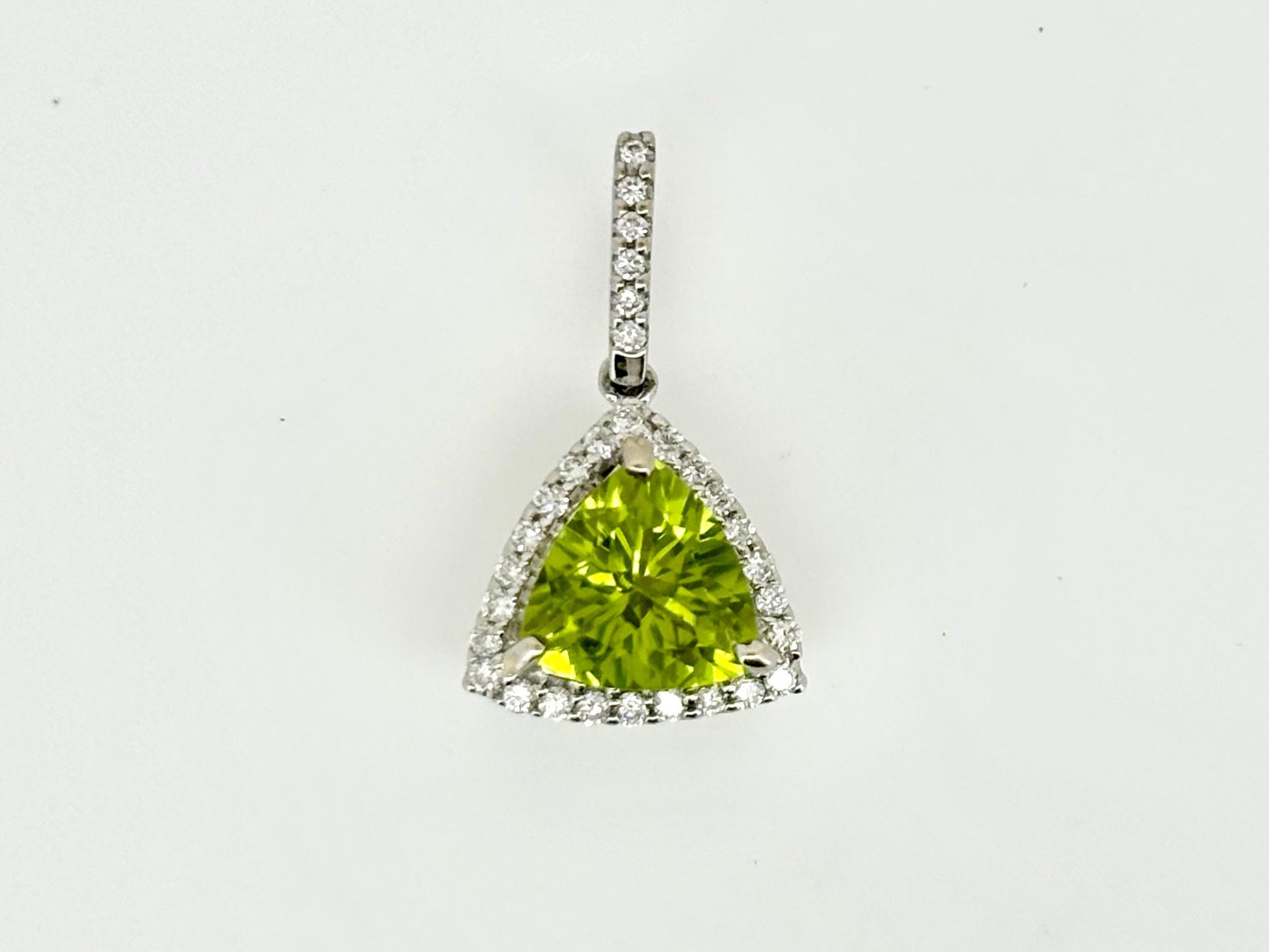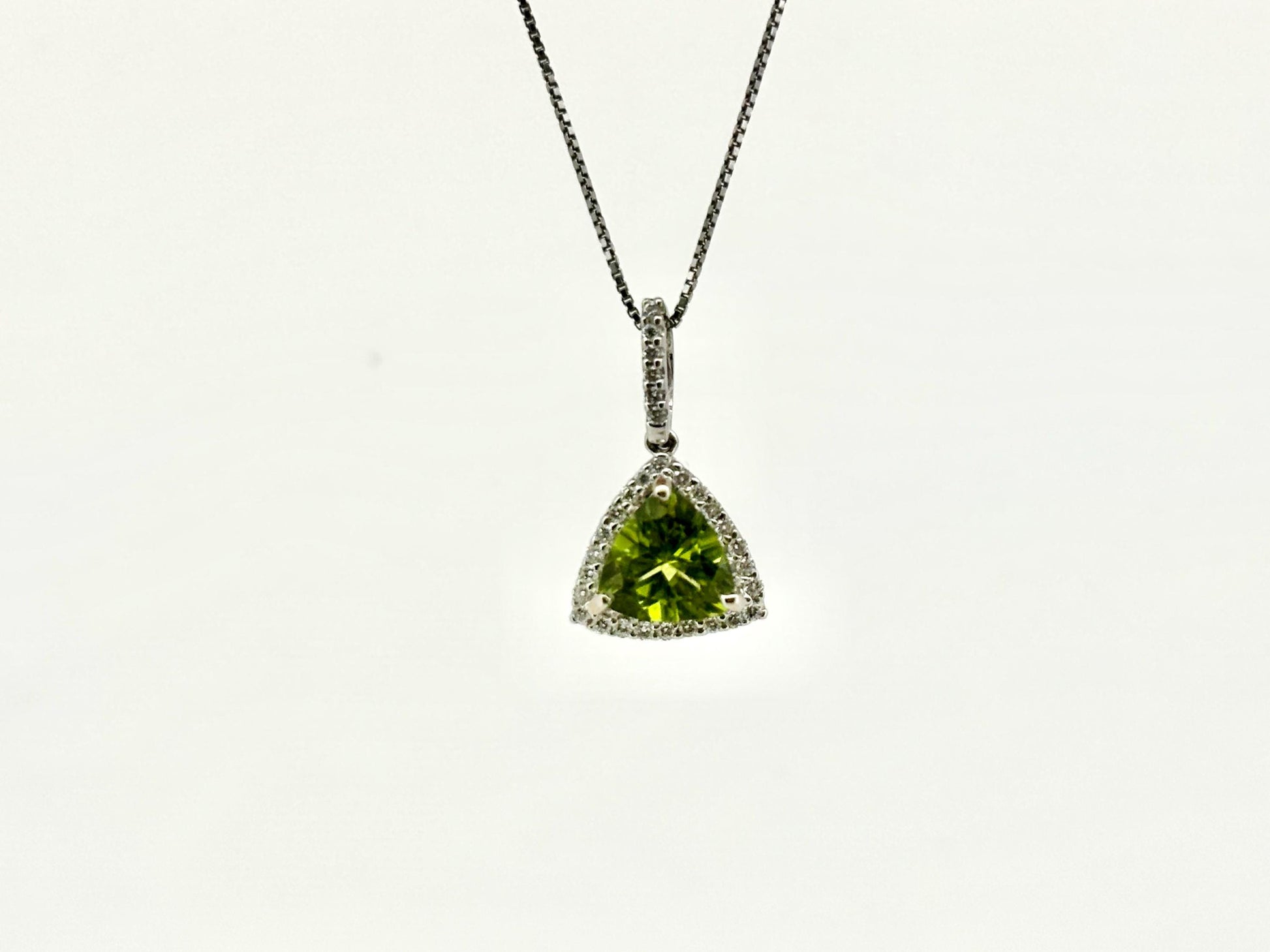Pendant: This beautiful 14K gold pendants width is approximetly 0.51 inches (13 millimeters), pendant height is approximetly 0.82 inches (21 millimeters), weight is approximetly 2.4 grams. It has very beautiful peridot and diamond stones. The pendant polished finish.