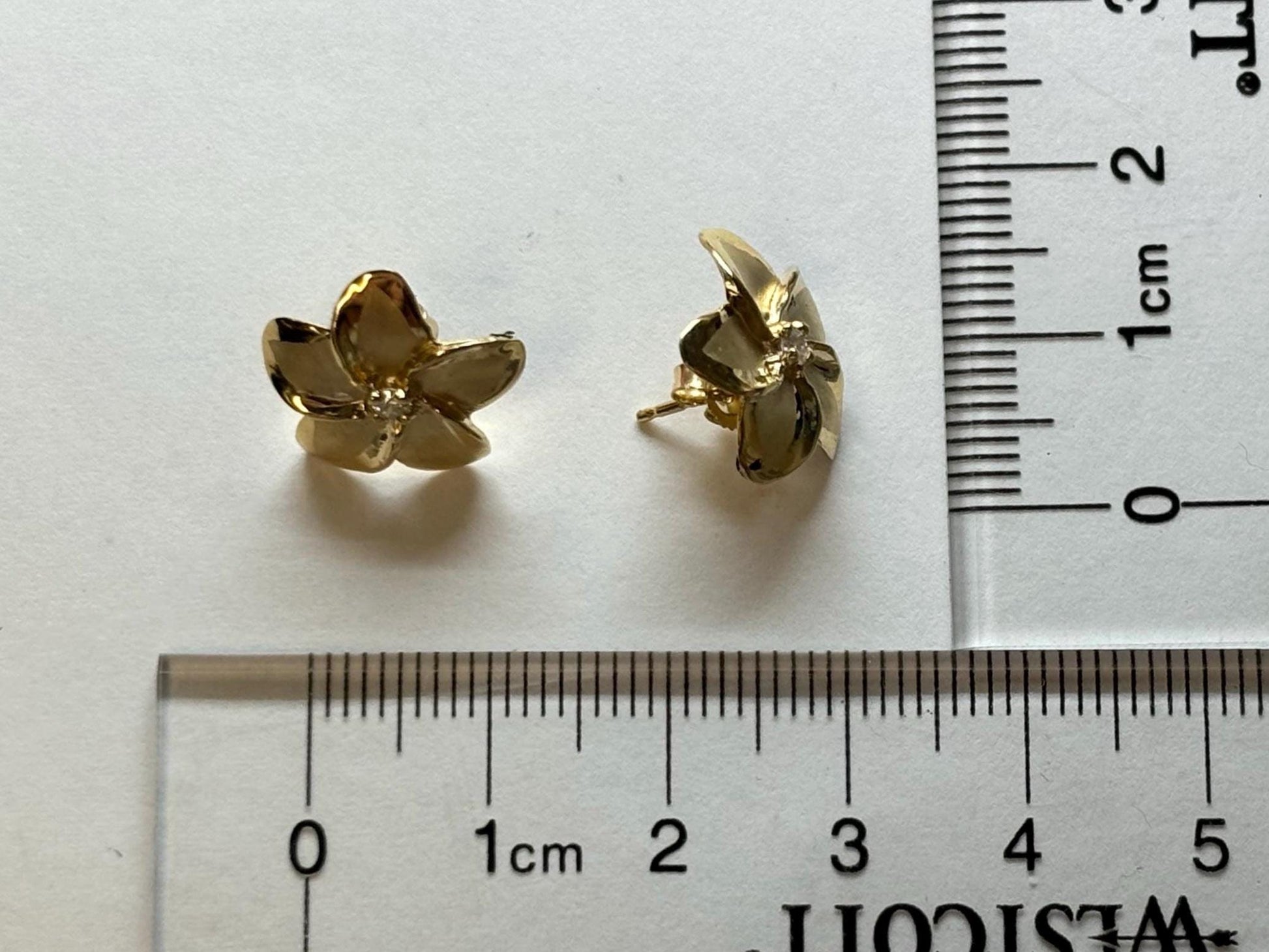 This beautiful 14K Solid Gold earring width is approximately 0.59 inches (15 millimeters), height is approximately 0.59inch (15 millimeters), It has very beautiful plumeria shape and 0.6ct total diamond in the middle. Earrings weight is 2.9gr.
