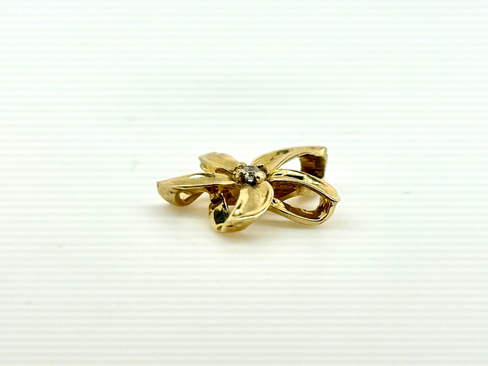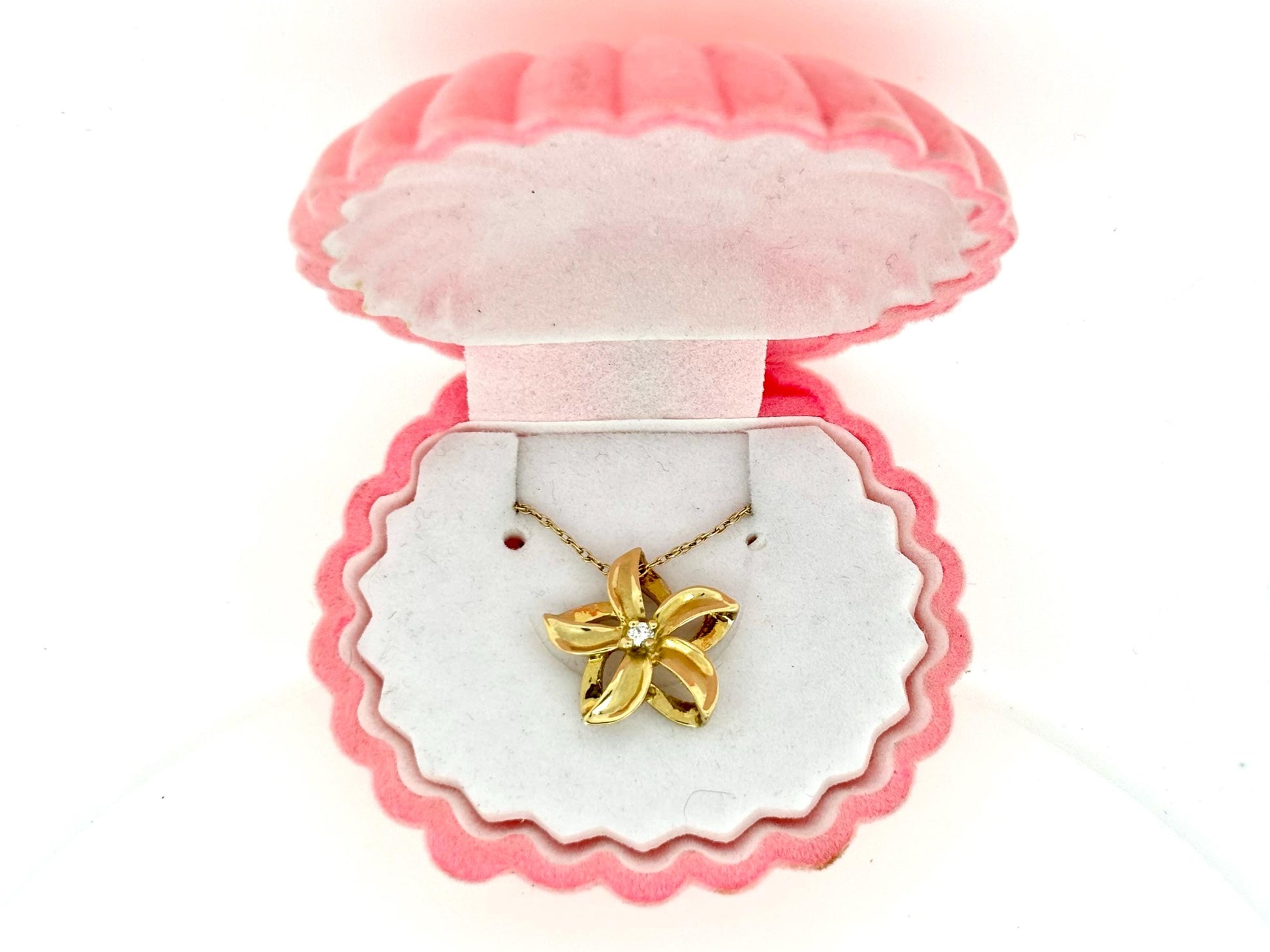 This beautiful 14K Solid Gold pendant width is approximately 0.47 inches (12 millimeters), height is approximately 0.47 inch (12 millimeters) with the bail, It has very beautiful plumeria shape and 0.04 ct Diamond in the middle. Pendants weight is 1.9 gr.