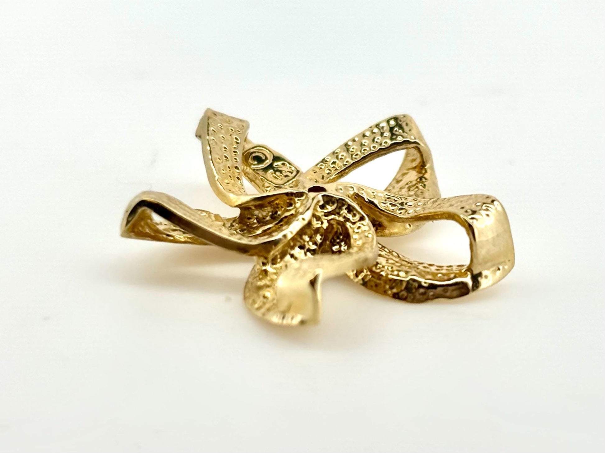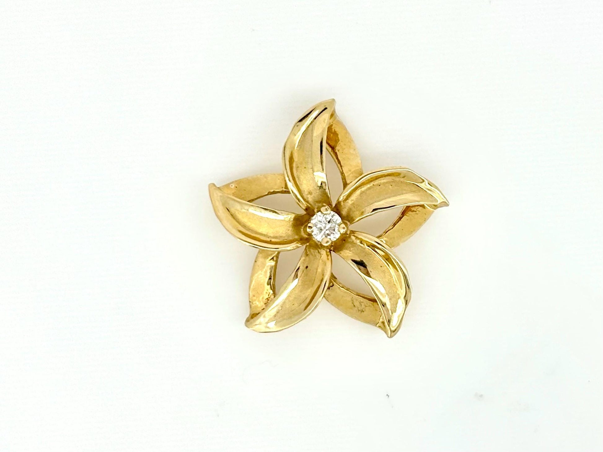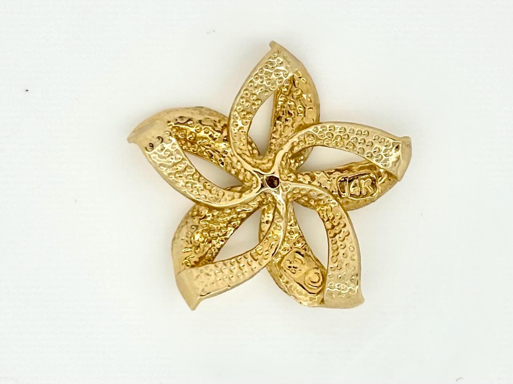This beautiful 14K Solid Gold pendant width is approximately 0.86 inches (22 millimeters), height is approximately 0.86 inch (22 millimeters) with the bail, It has very beautiful plumeria shape and 0.1 ct Diamond in the middle. Pendants weight is 2.9gr.