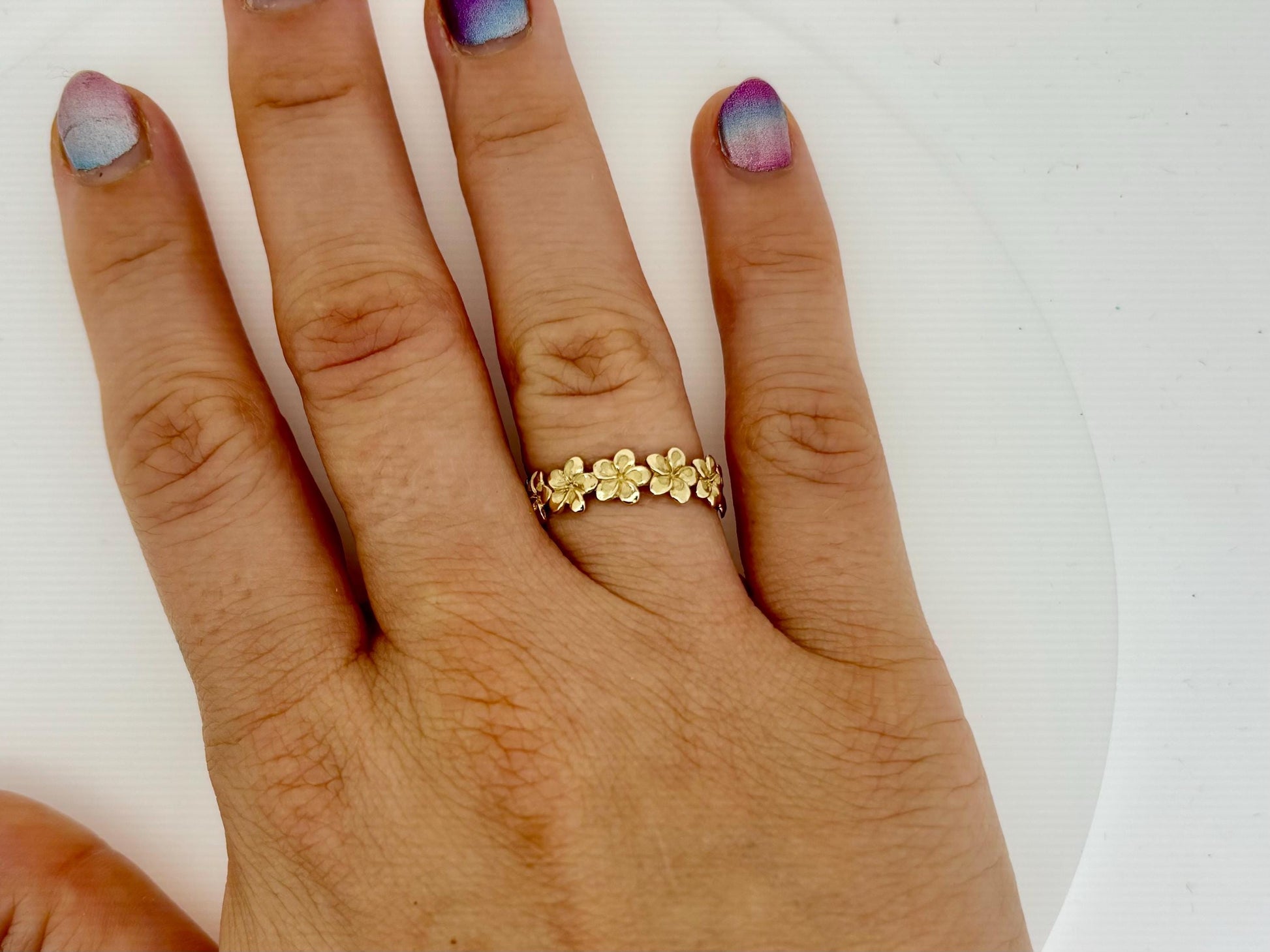 The plumeria flower symbolizes love, spring and new beginnings in our culture. In Hawaii, the plumeria can be used symbolize a woman's romantic status when worn in the hair. It’s is very special to wear it as a wedding ring. I am very happy to send this beautiful ring with my island blessings.