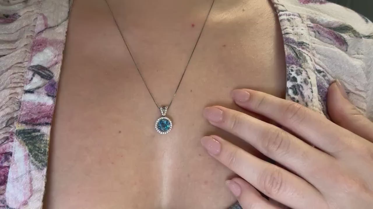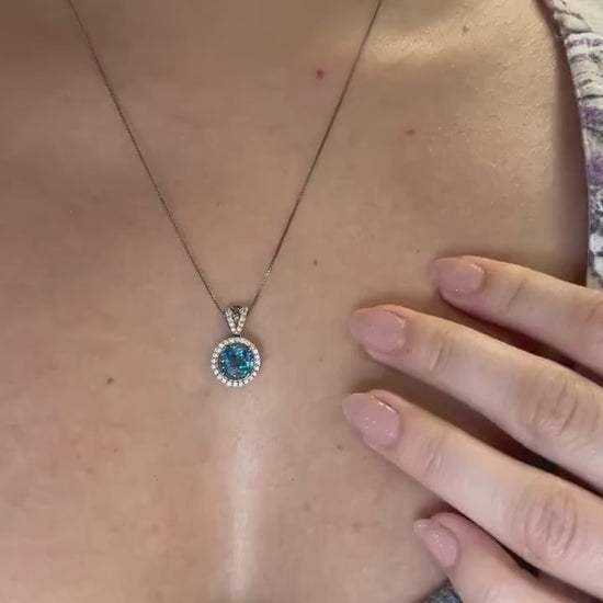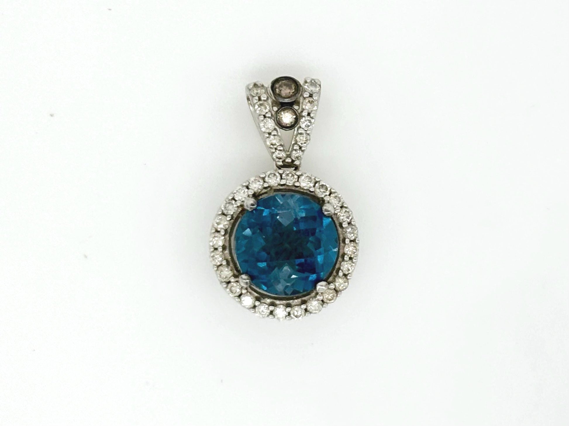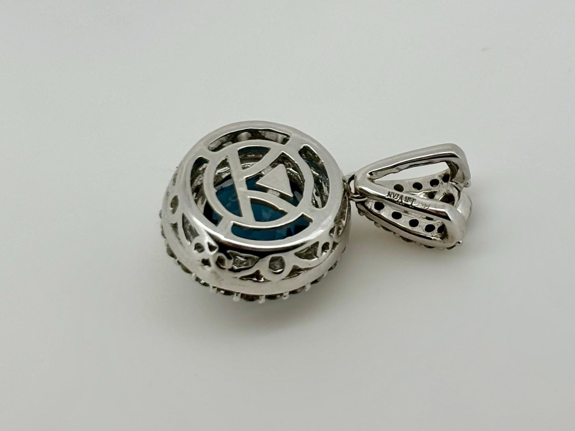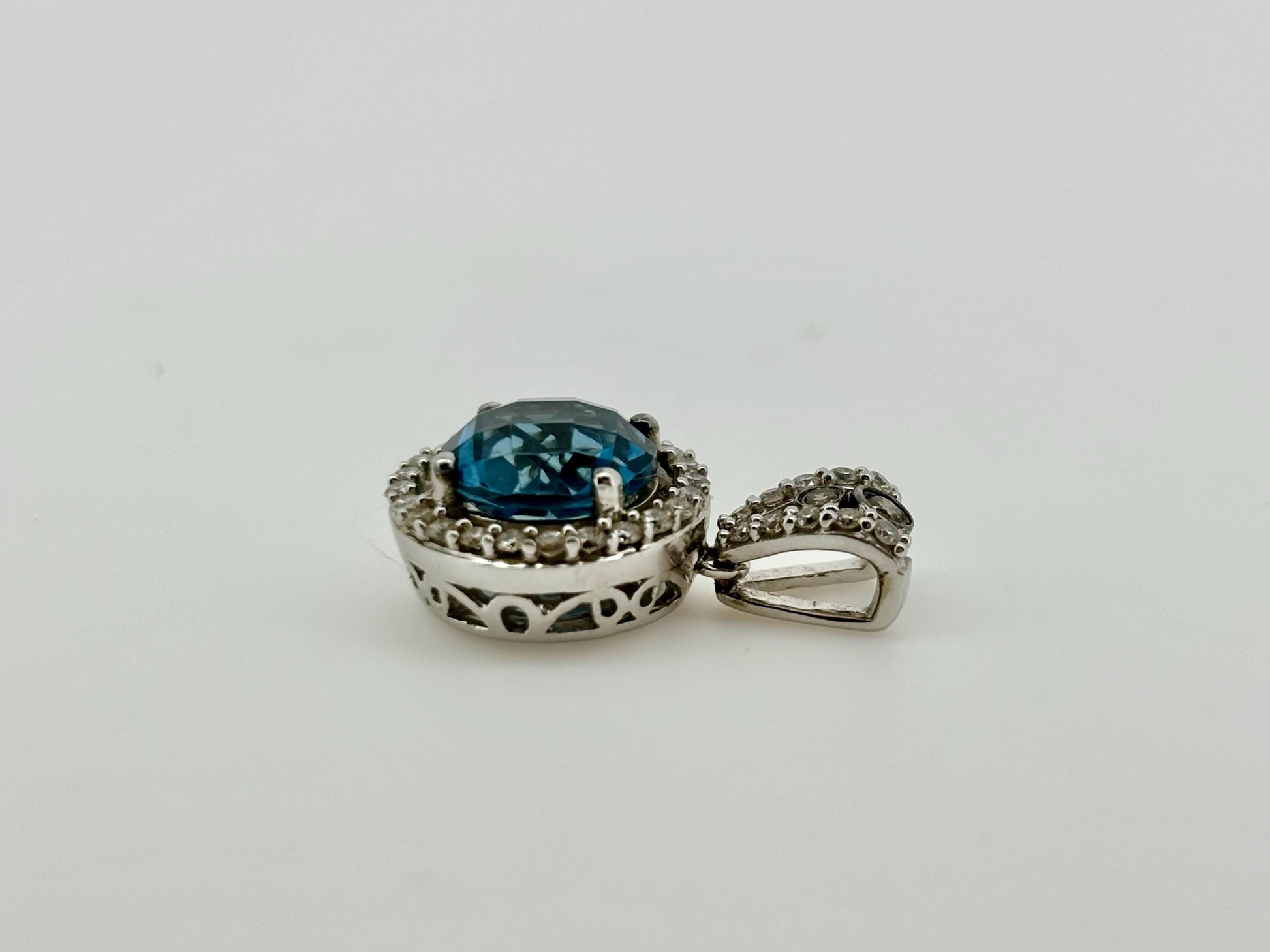 This elegant 14K solid white gold pendant features a vibrant 8mm blue topaz accented with genuine diamonds. It weighs approximately 2.7 grams. The pendant, including the bail, measures about 18 mm (1.8 cm) in height and 10 mm (1 cm) in width. A refined and radiant piece—perfect for December birthdays, ocean lovers, or anyone in need of a little clarity and sparkle.