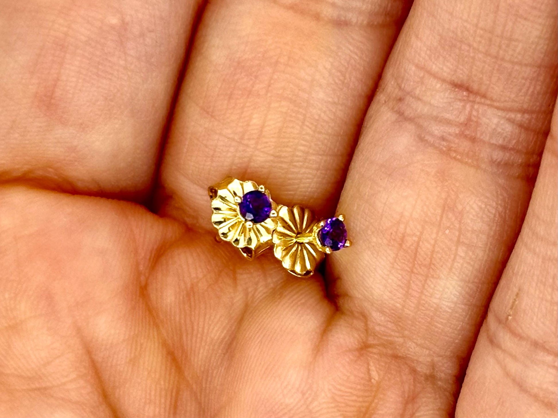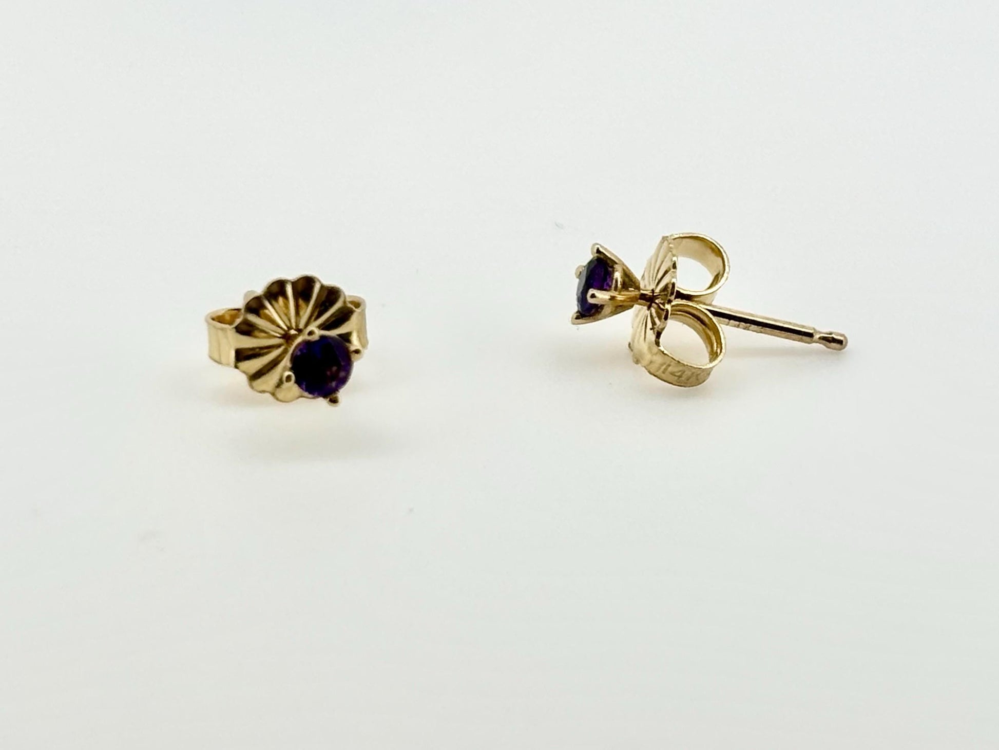 These petite 2.5mm round amethyst studs are set in 14k solid yellow gold and secured with classic clutch backs. Their size makes them ideal for second piercings, minimal looks, or thoughtful everyday wear.