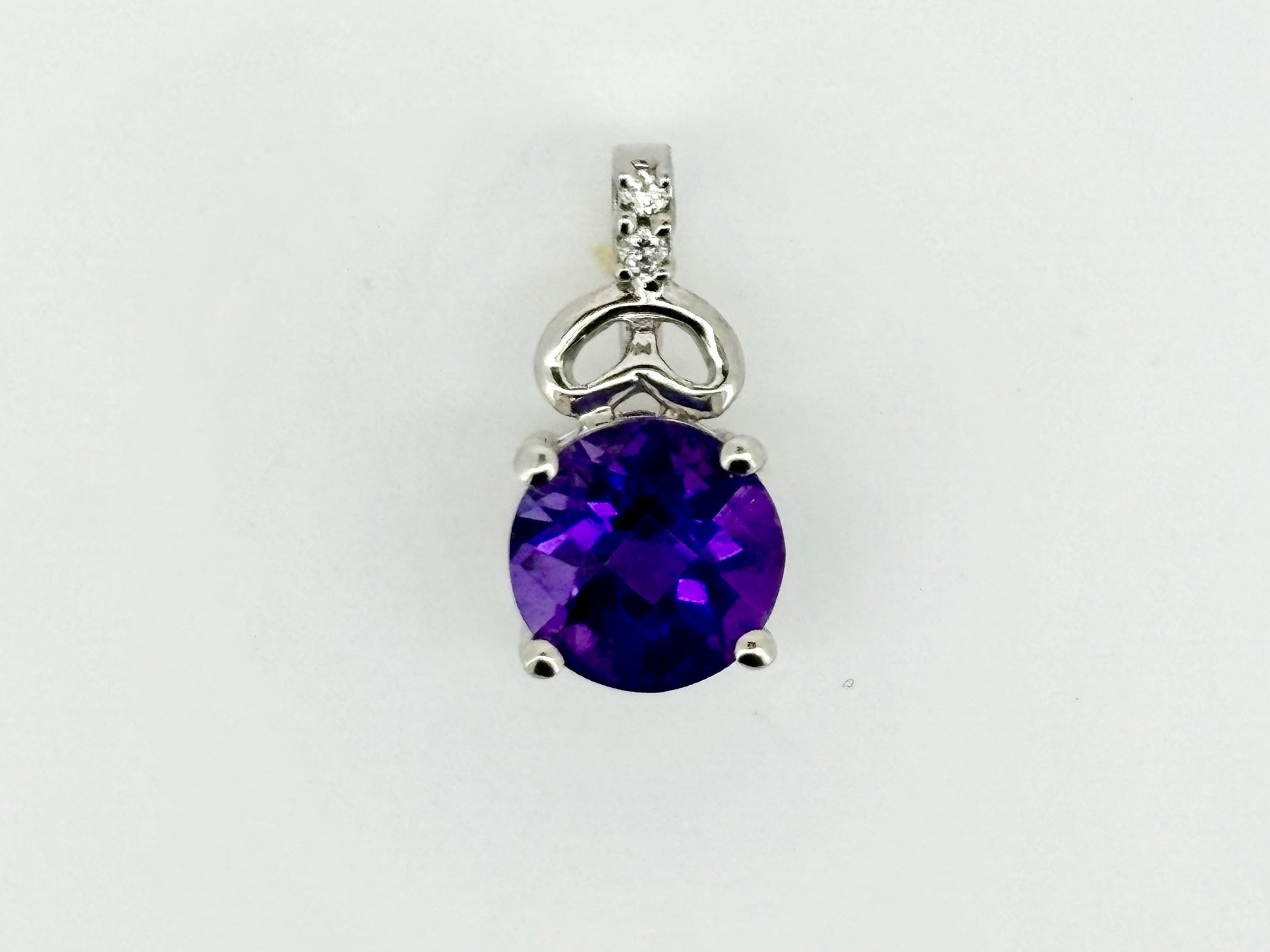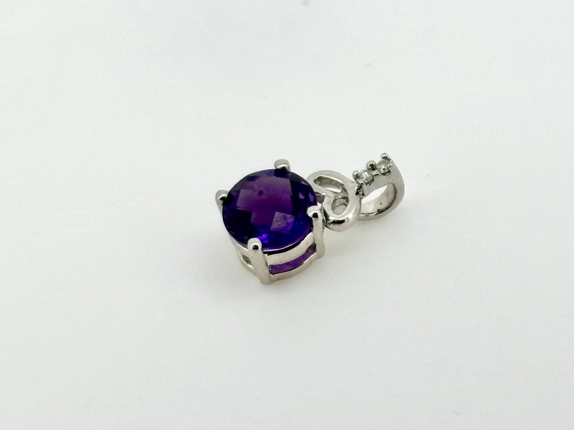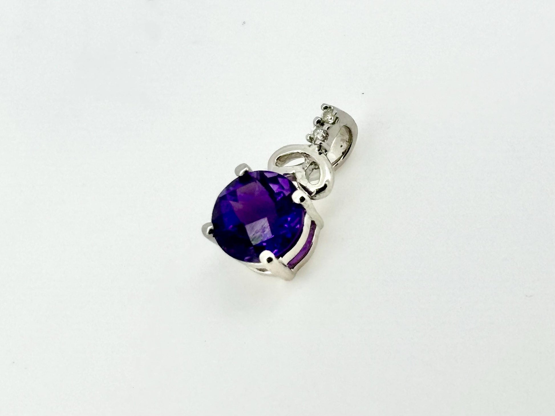 This stunning 14K white gold pendant features a natural 1.67 carat amethyst accented with 0.022 carat total weight (ctw) of diamonds. It weighs 1.8 grams and measures 1.7 cm length (17mm) and 1 cm width (10 mm). A vibrant and elegant piece perfect for February birthdays or anyone drawn to the power of purple.
