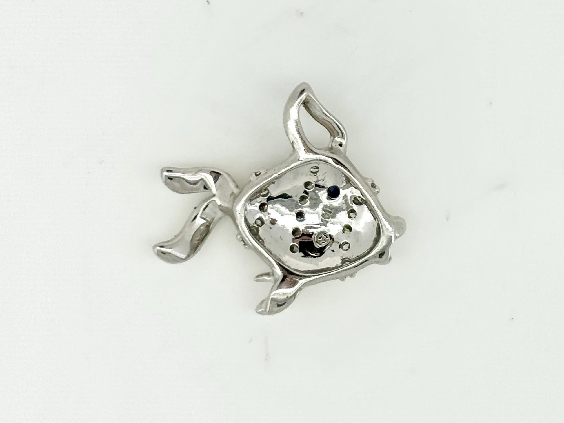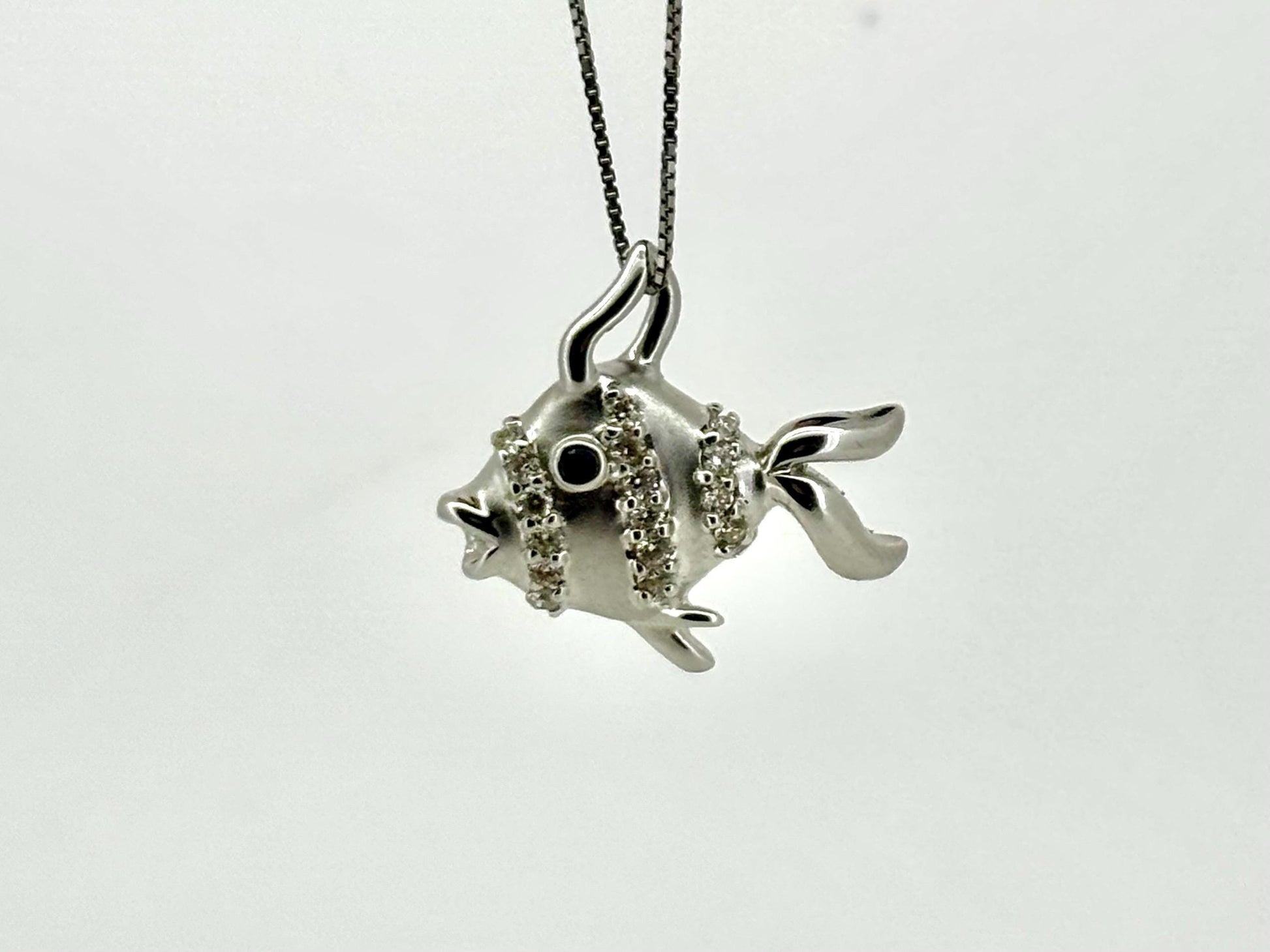 Expertly crafted in radiant 14K white gold, this fish pendant is very dainty . It weighs approximately 3.6 grams and measures about 21 mm in height and 22 mm in width. A refined and luminous piece, ideal for celebrating life's transformative moments or gifting someone truly cherished.
