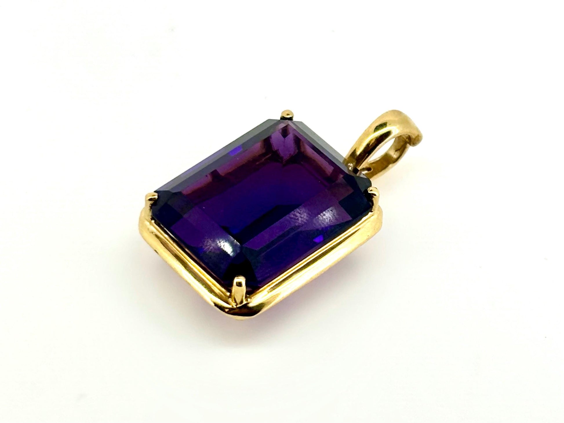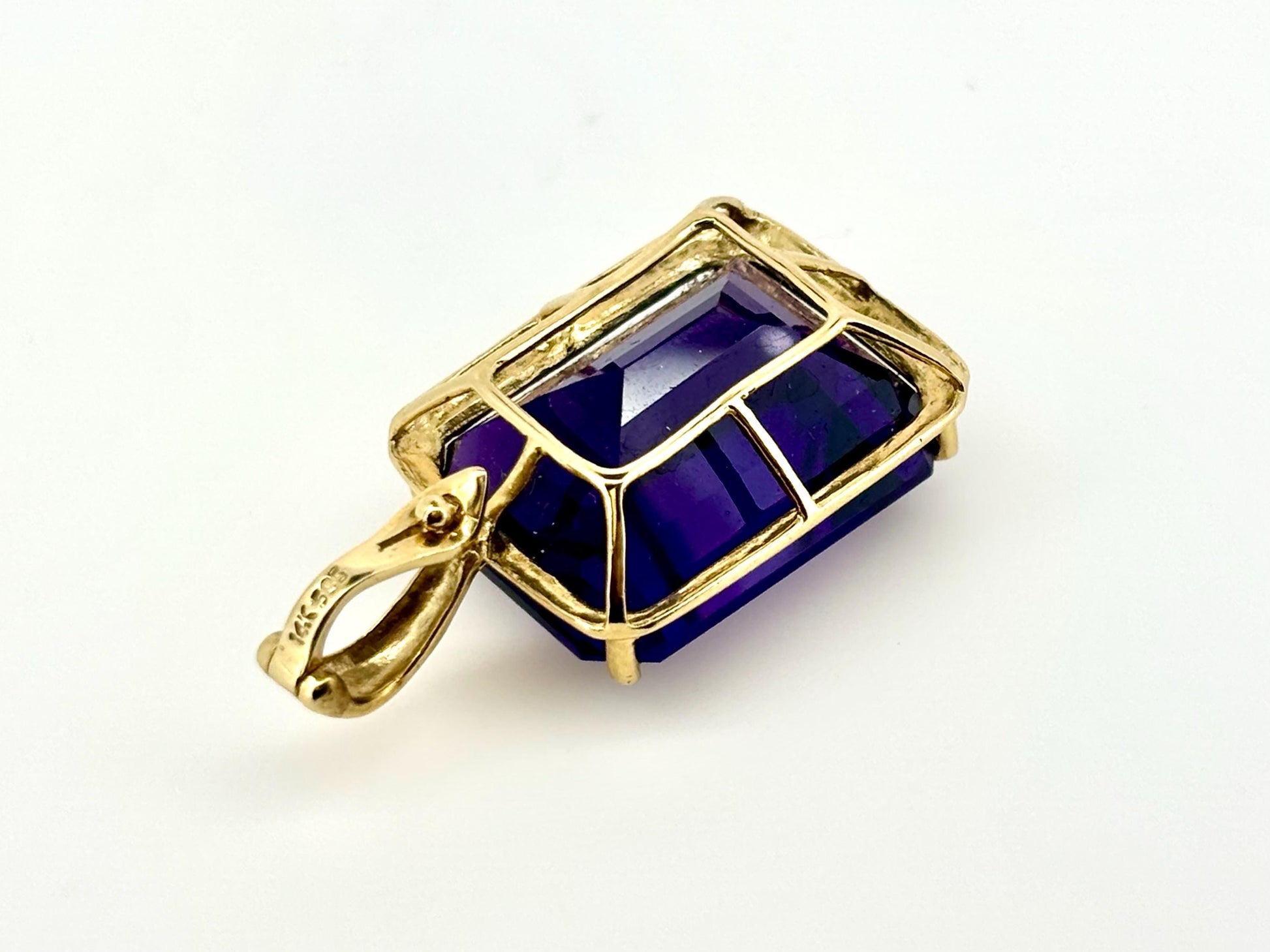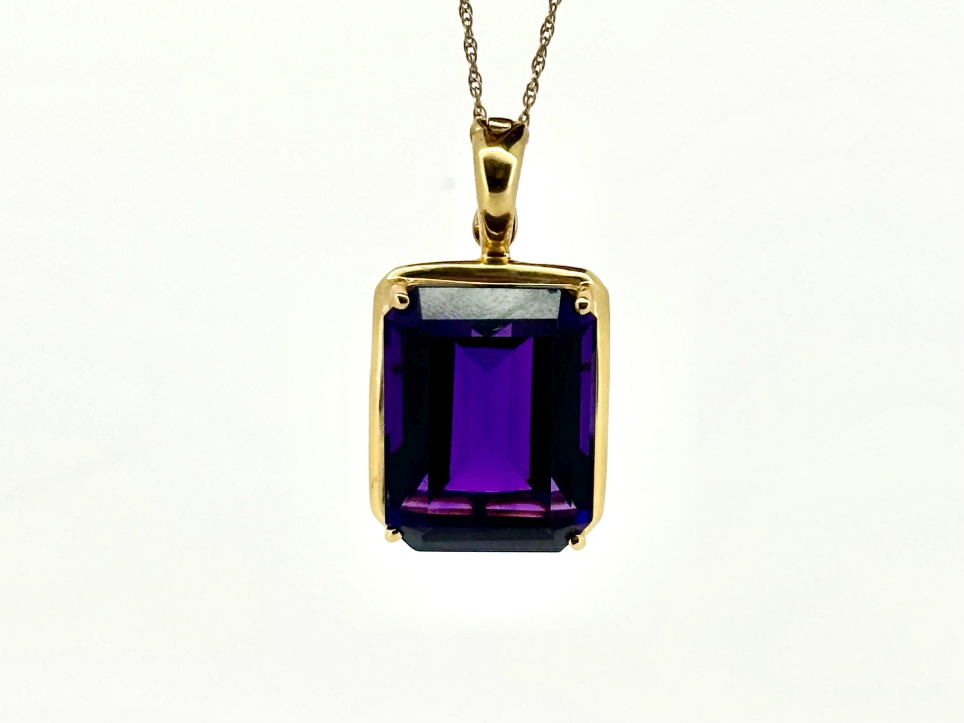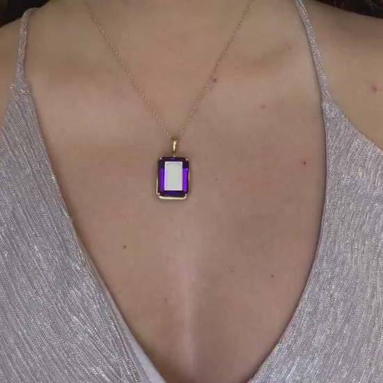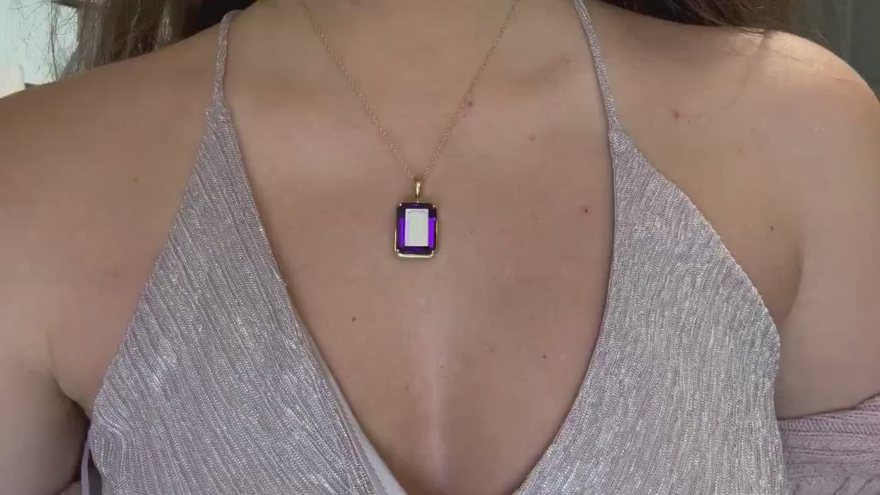 This large 19.51ct genuine amethyst pendant is set in 14k solid yellow gold. Its impressive size and deep purple brilliance make it a stunning statement piece for those who embrace elegance with impact.