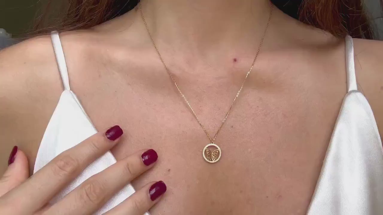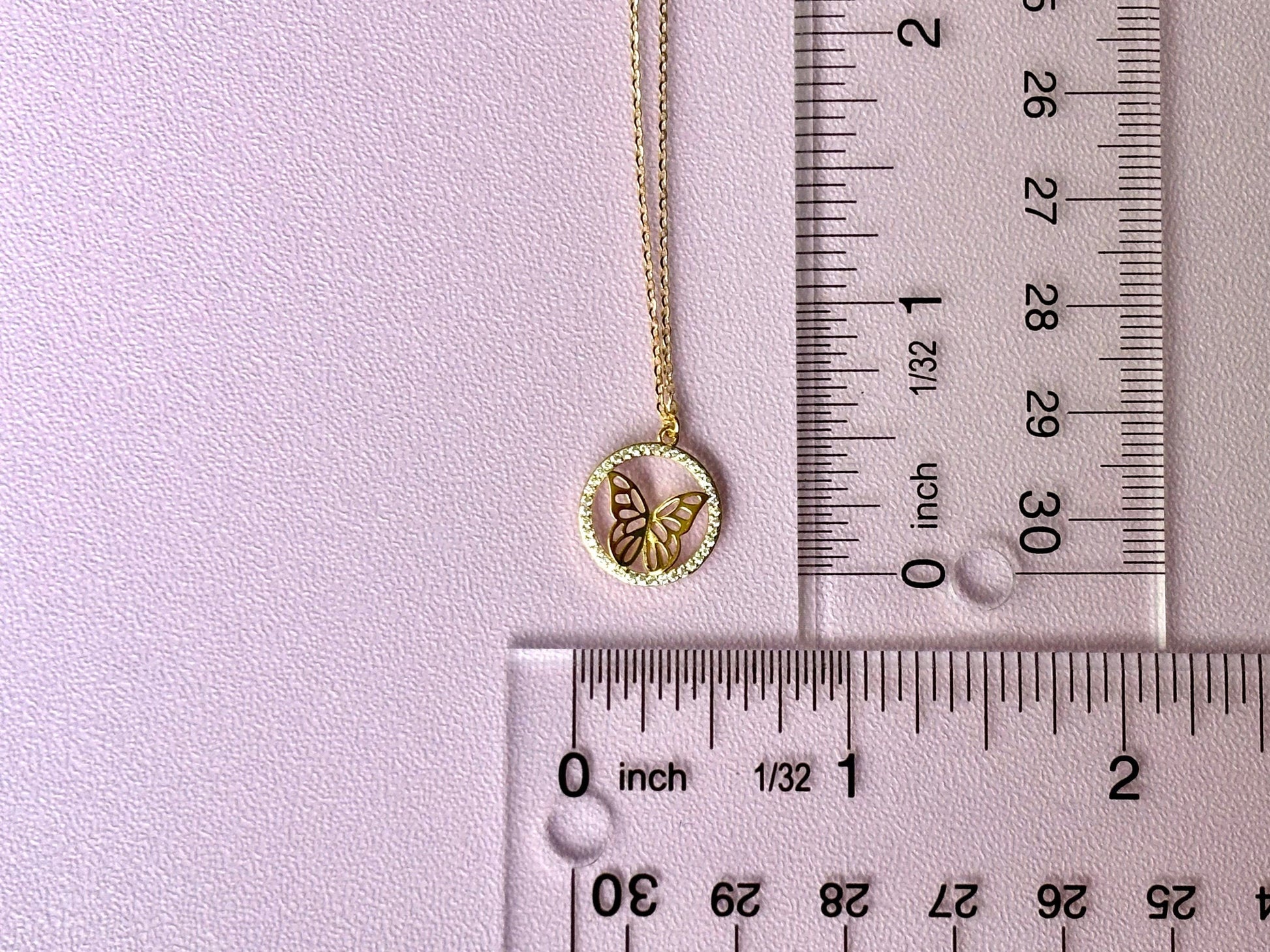 Pendant: This beautiful 14K gold plated 925 Sterling Silver pendant is 14K gold plated to prevent it from tarnishing. Pendant width is approximately 0.5 inches (12.7 millimeters), height is approximately 0.5 inch (12.7 millimeters). It has very beautiful butterfly shape sitting in the middle of a shinny madalion covered with brilliant cut cubic zirconia stones.