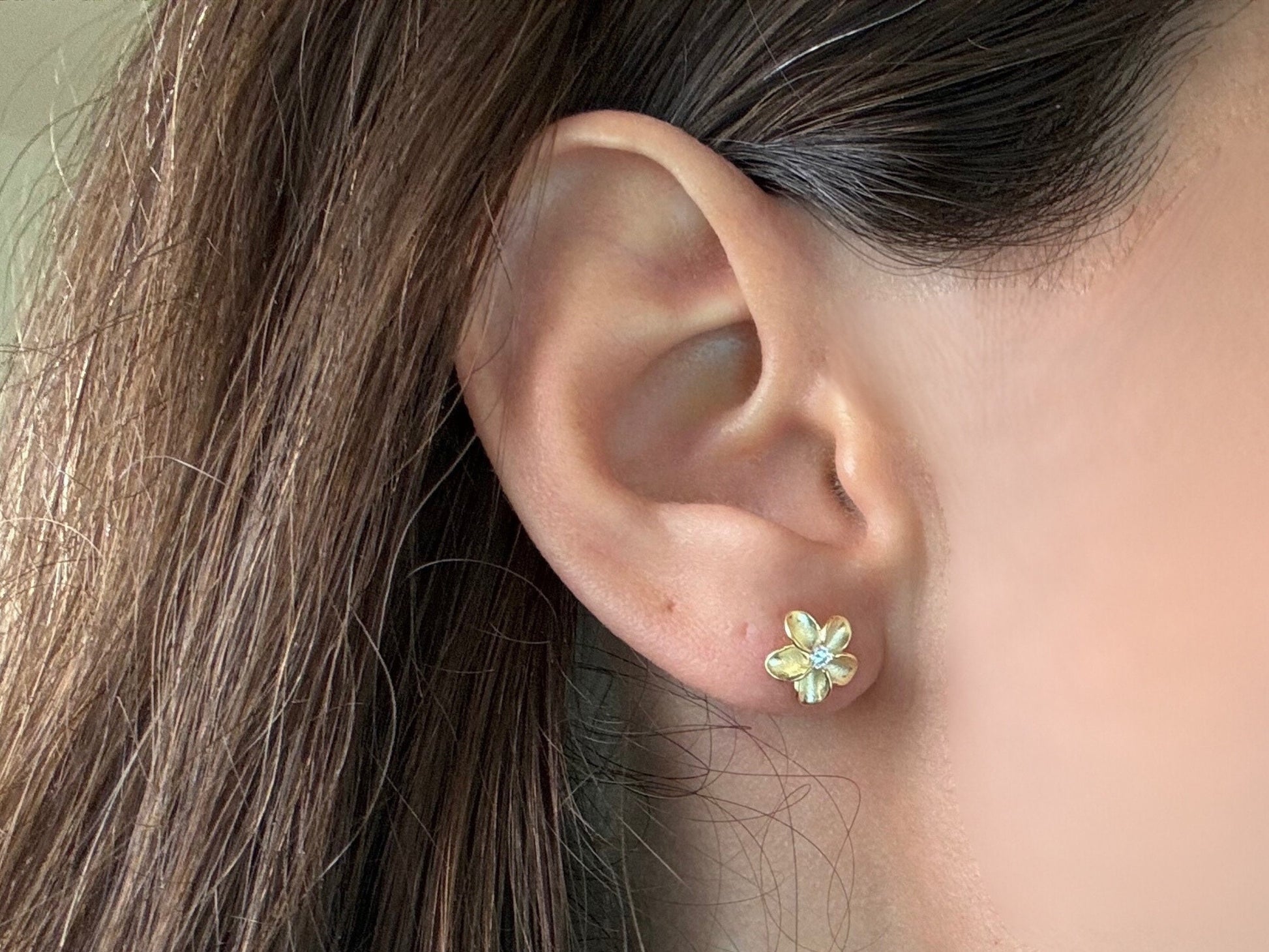 Earrings: This beautiful 14k gold plated 925 Sterling Silver stud earrings are gold plated to prevent it from tarnishing. It has round brilliant cut cubic zirconia set in the heart of the flower in a bar type setting. The plumeria flower petals are matte (brushed) finish and precisely polished edges. Earrings width is approximately 0.39 inches(10 millimeters)