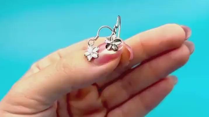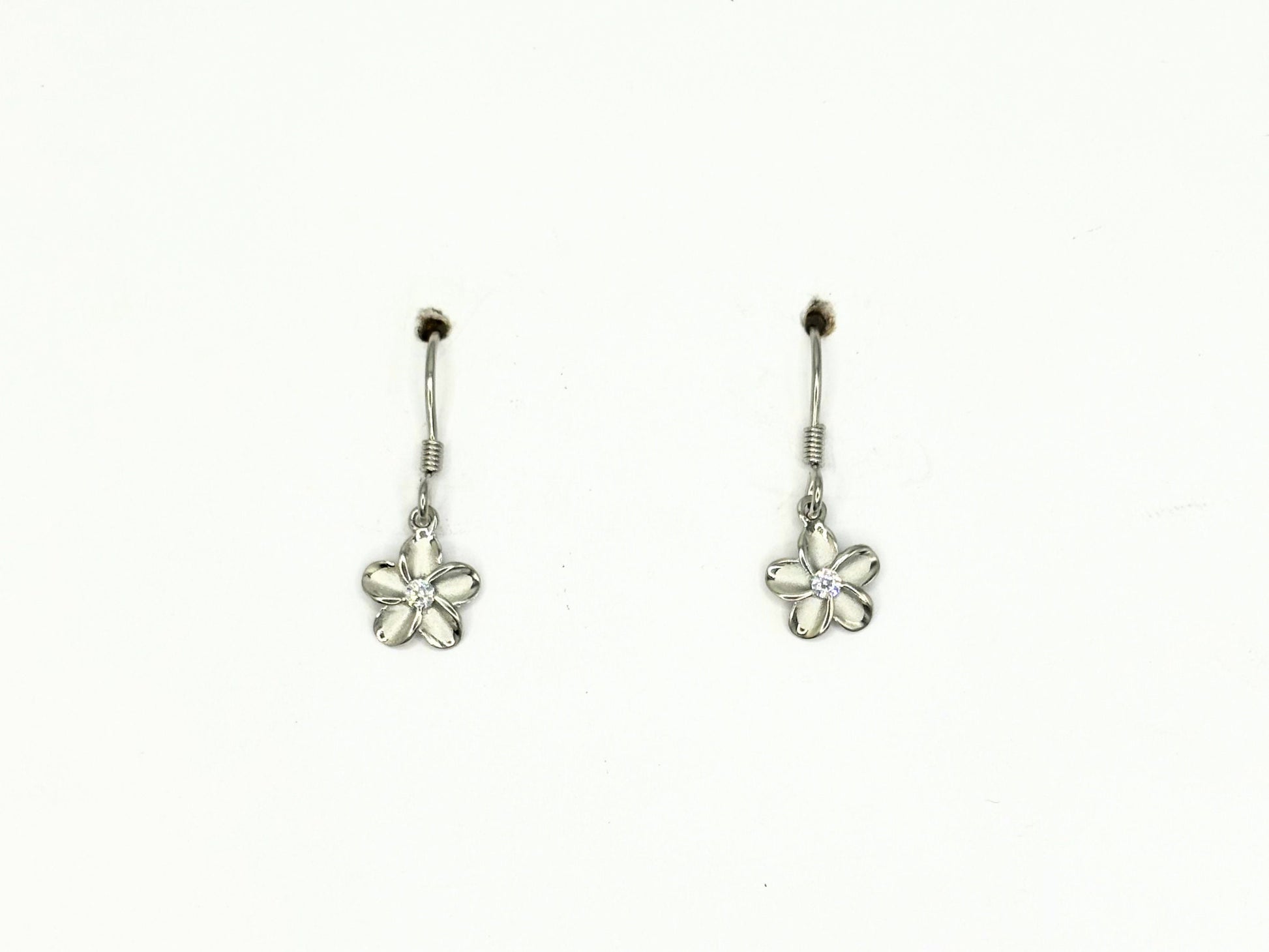 Hawaiian 925 Sterling Silver Rhodium Plated Plumeria Hanging Earrings Cute Gift for Wife Flower Mom Girlfriend sister Stone shiny CZ