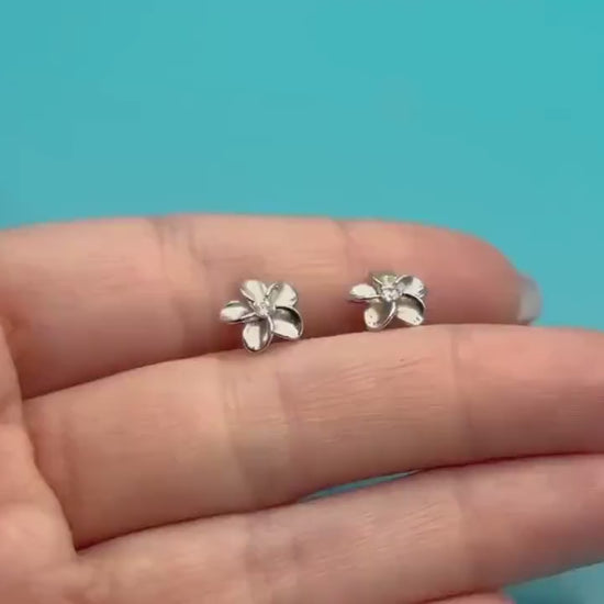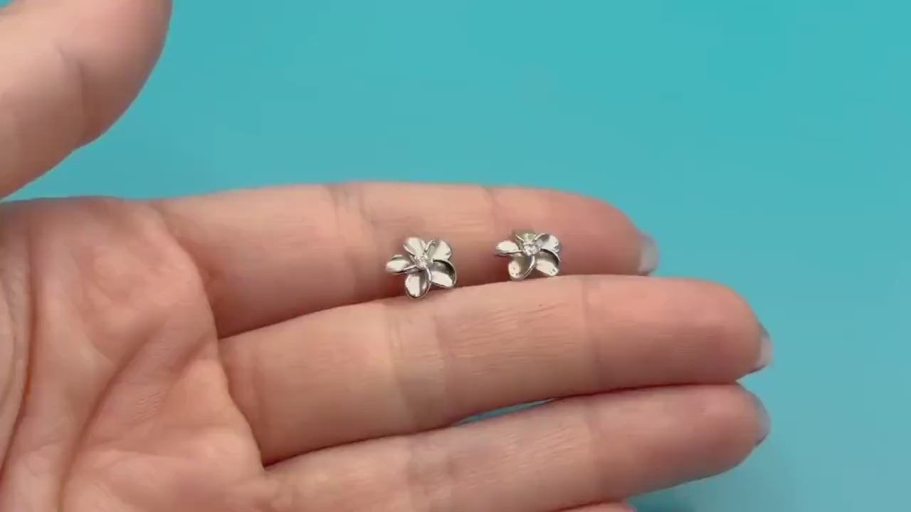 Hawaiian 925 Sterling Silver Rhodium Plated Plumeria Stud Earrings Cute Gift for Wife Flower Mom Girlfriend sister Stone shiny CZ