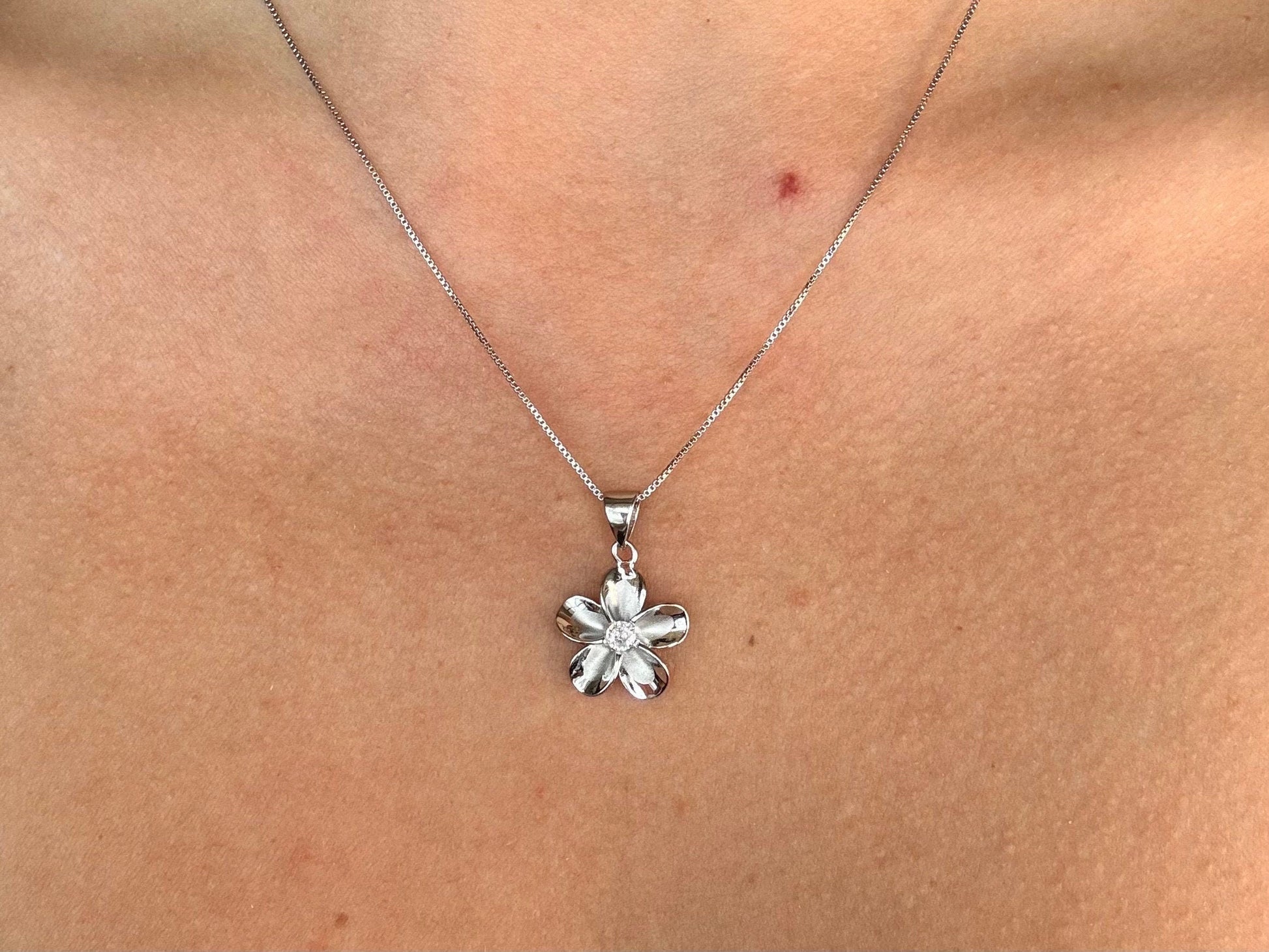 Hawaiian Plumeria Flower 925 Sterling Silver Tarnish Free Necklace with chain Cute Valentines Gift for her Wife Romantic Girlfriend Stone CZ