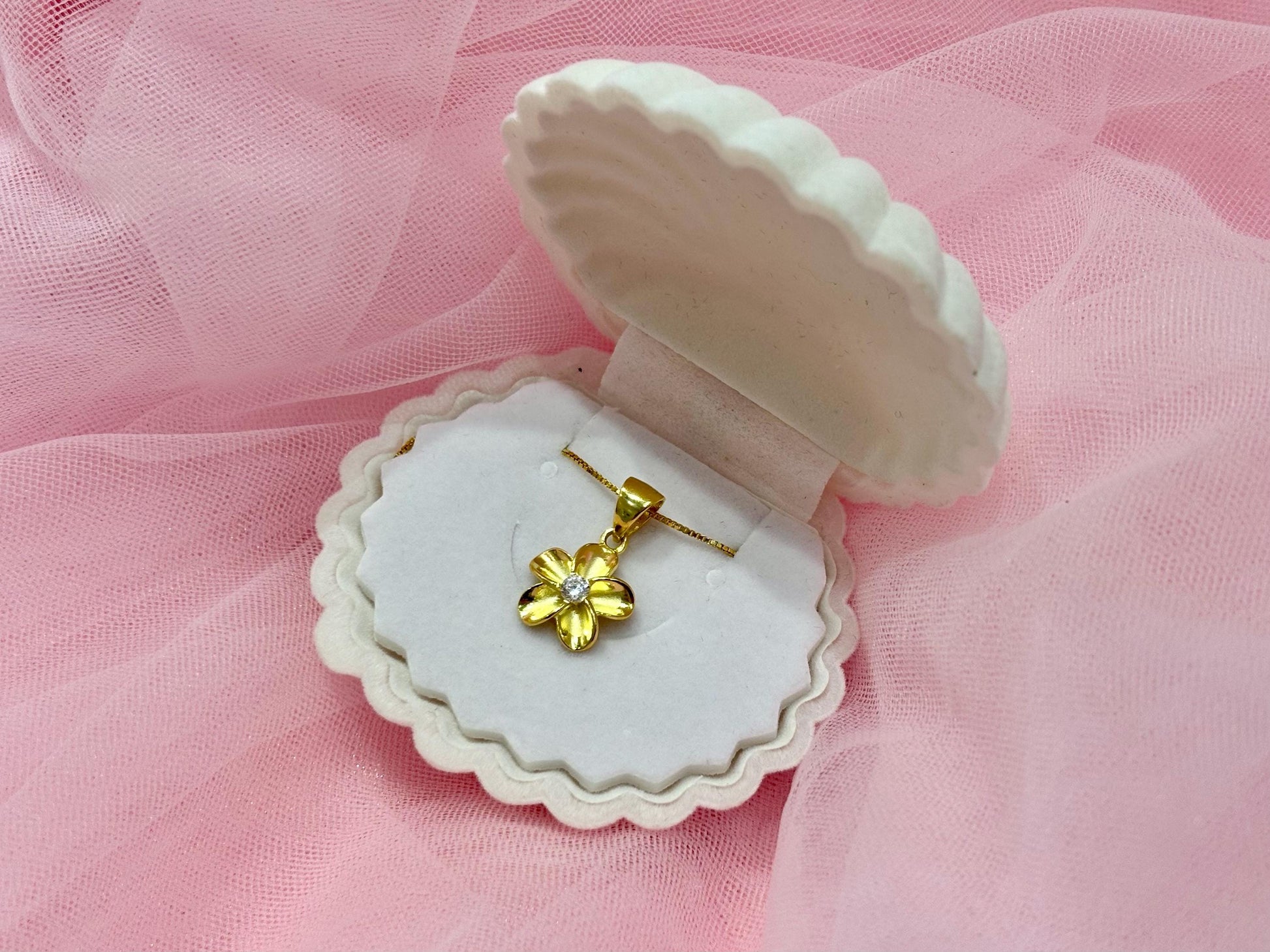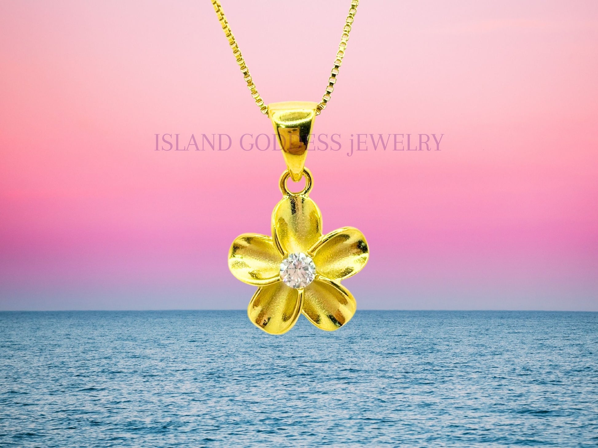 Hawaiian Plumeria Flower Necklace 14K Gold Plated Sterling Silver with Sparkling CZ Stone Romantic Jewelry Gift for her Wife, Mom Girlfriend