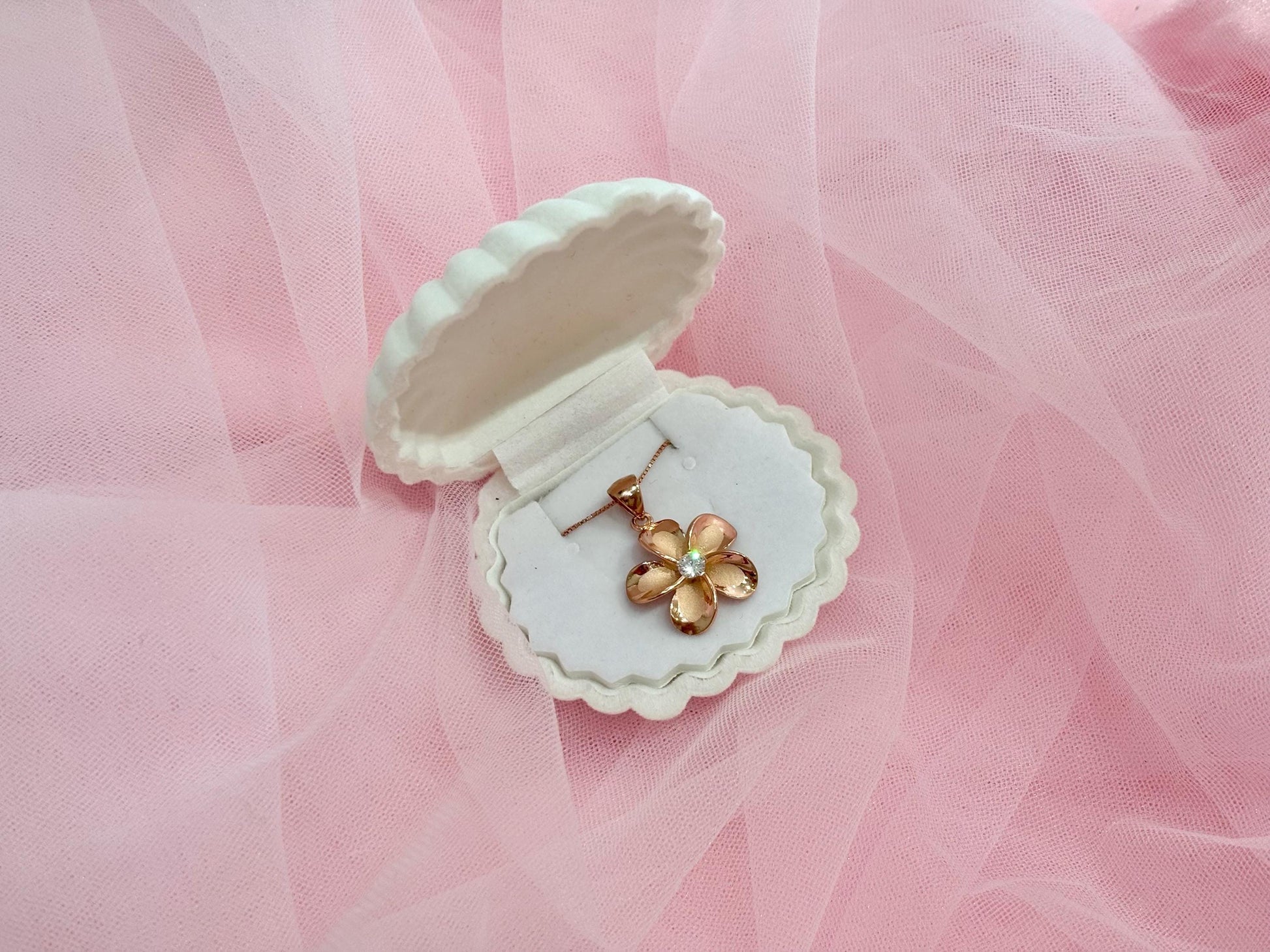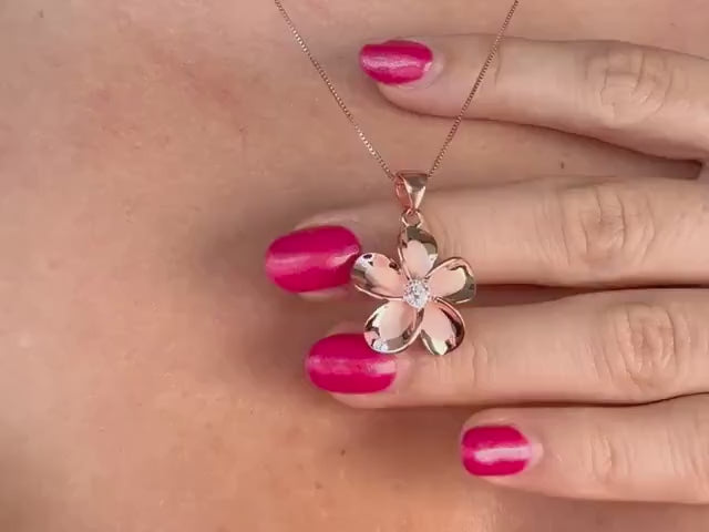 Hawaiian Plumeria Flower Necklace, 14K Rose Gold-Plated 925 Sterling Silver with CZ, Sparkly Romantic Gift for Wife, Mom, Girlfriend