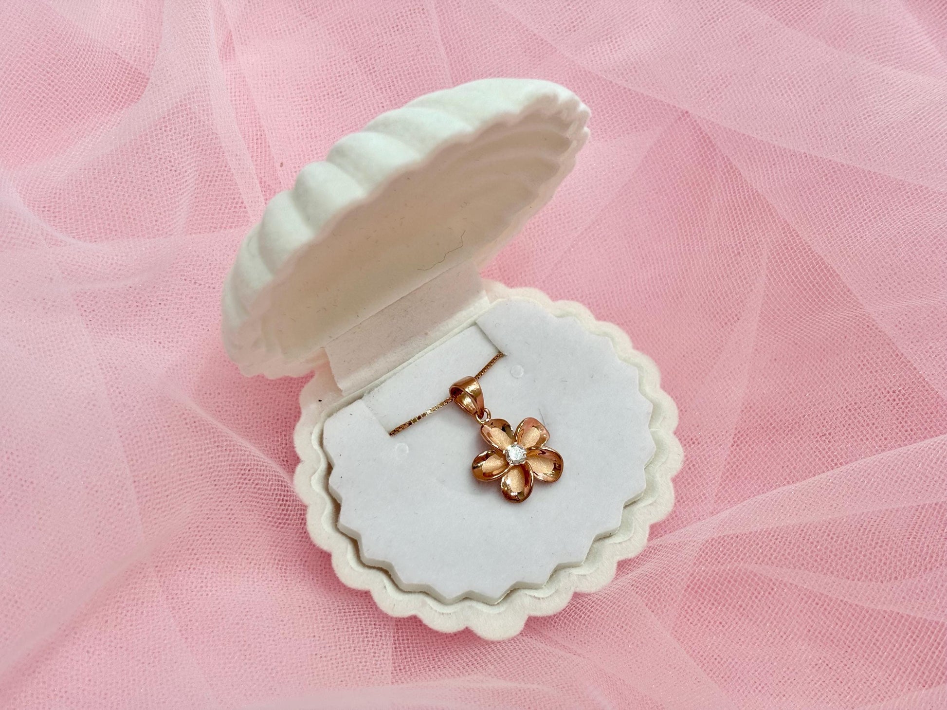Pendant: This beautiful 14k rose gold plated 925 Sterling Silver pendant is rose gold plated to prevent it from tarnishing. It has round brilliant cut cubic zirconia set in the heart of the flower in a bar type setting. The plumeria flower petals are matte (brushed) finish and precisely polished edges. Triangle shaped bail is designed to be used with larger chains if needed.