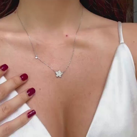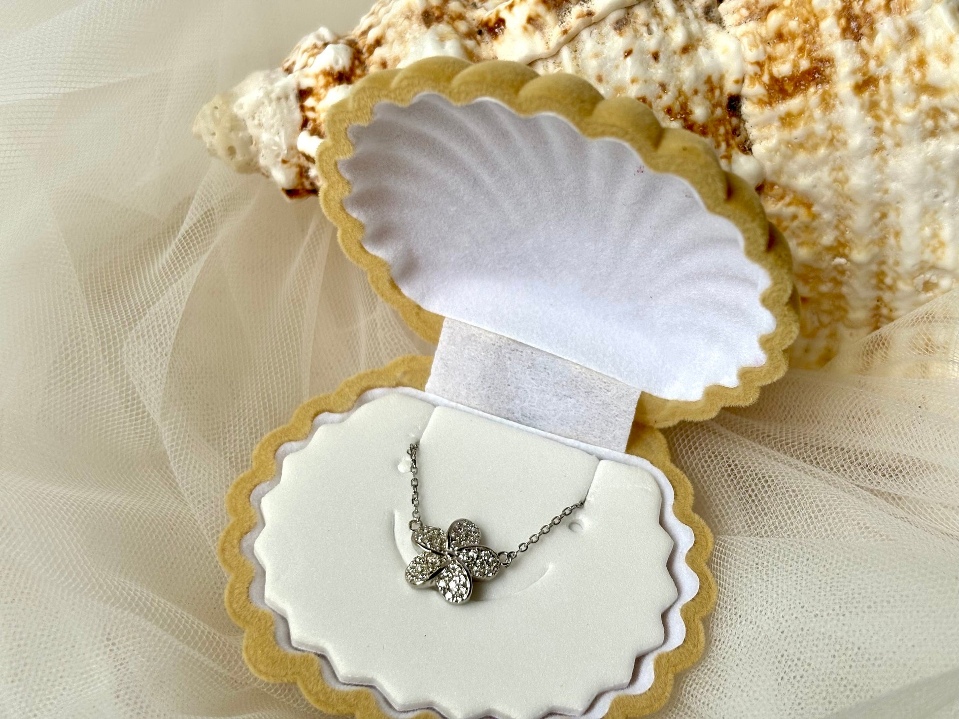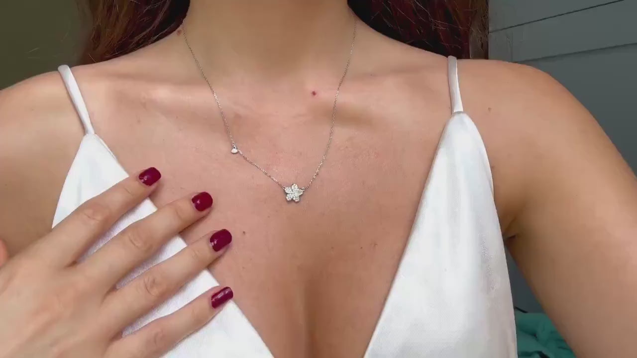 This beautiful necklace features a plumeria flower accented with a brilliant round cubic zirconia at its center, paired with a dainty shell charm for a touch of ocean spirit.