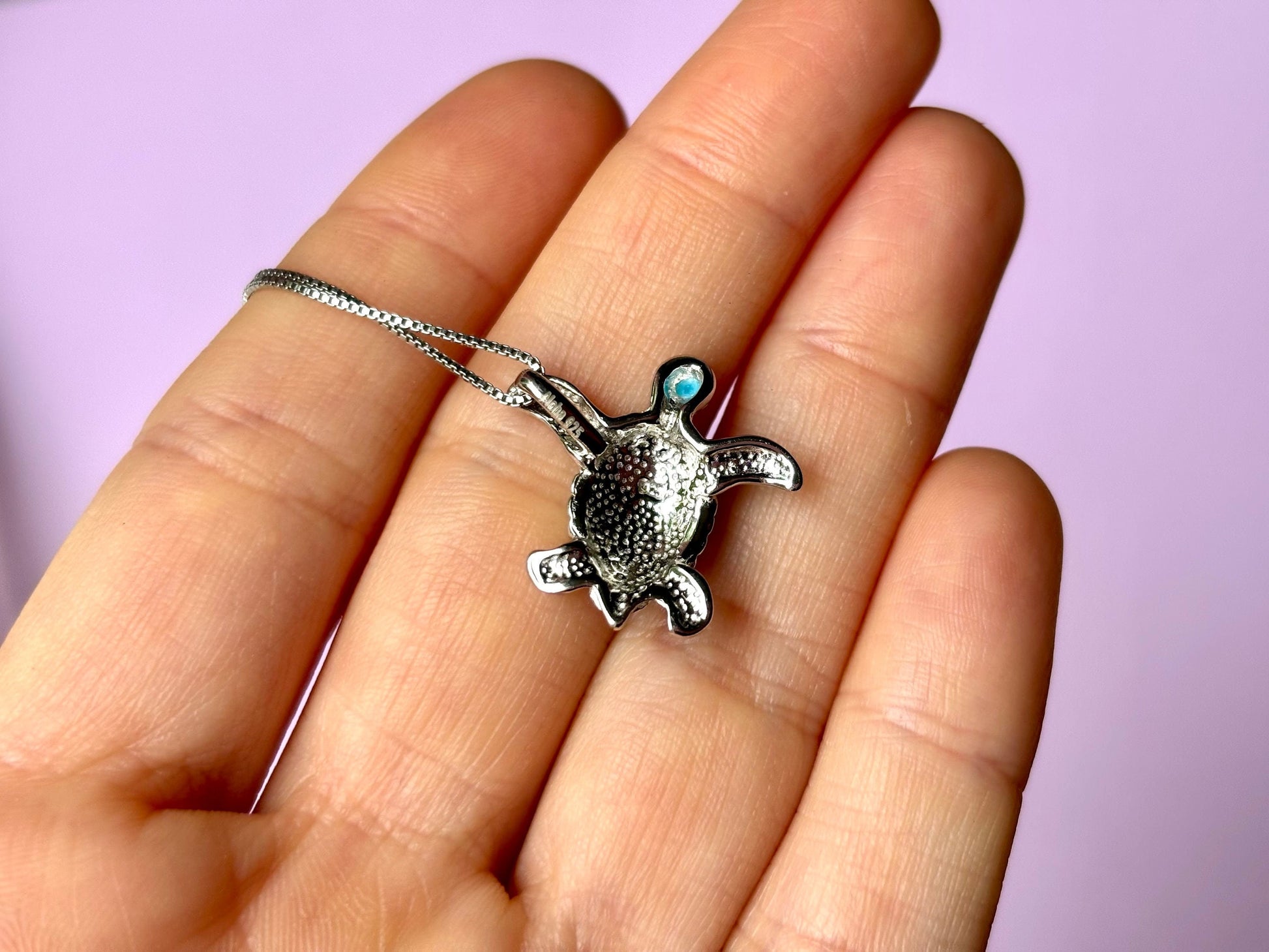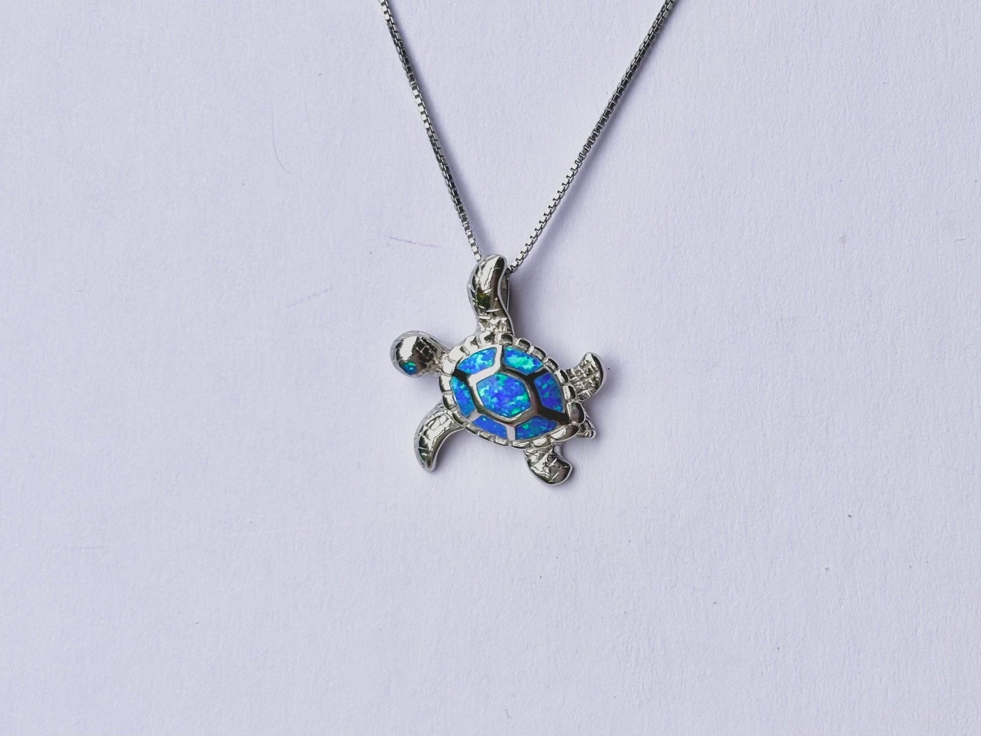 Pendant: This beautiful pendant is crafted from 925 Sterling Silver and rhodium plated to prevent tarnishing. The turtle shell is filled with manmade blue opal, creating a striking, ocean-inspired look. The pendant measures approximately 0.7 inches (18 mm) in width and 0.74 inches (19 mm) in height, with a polished finish.