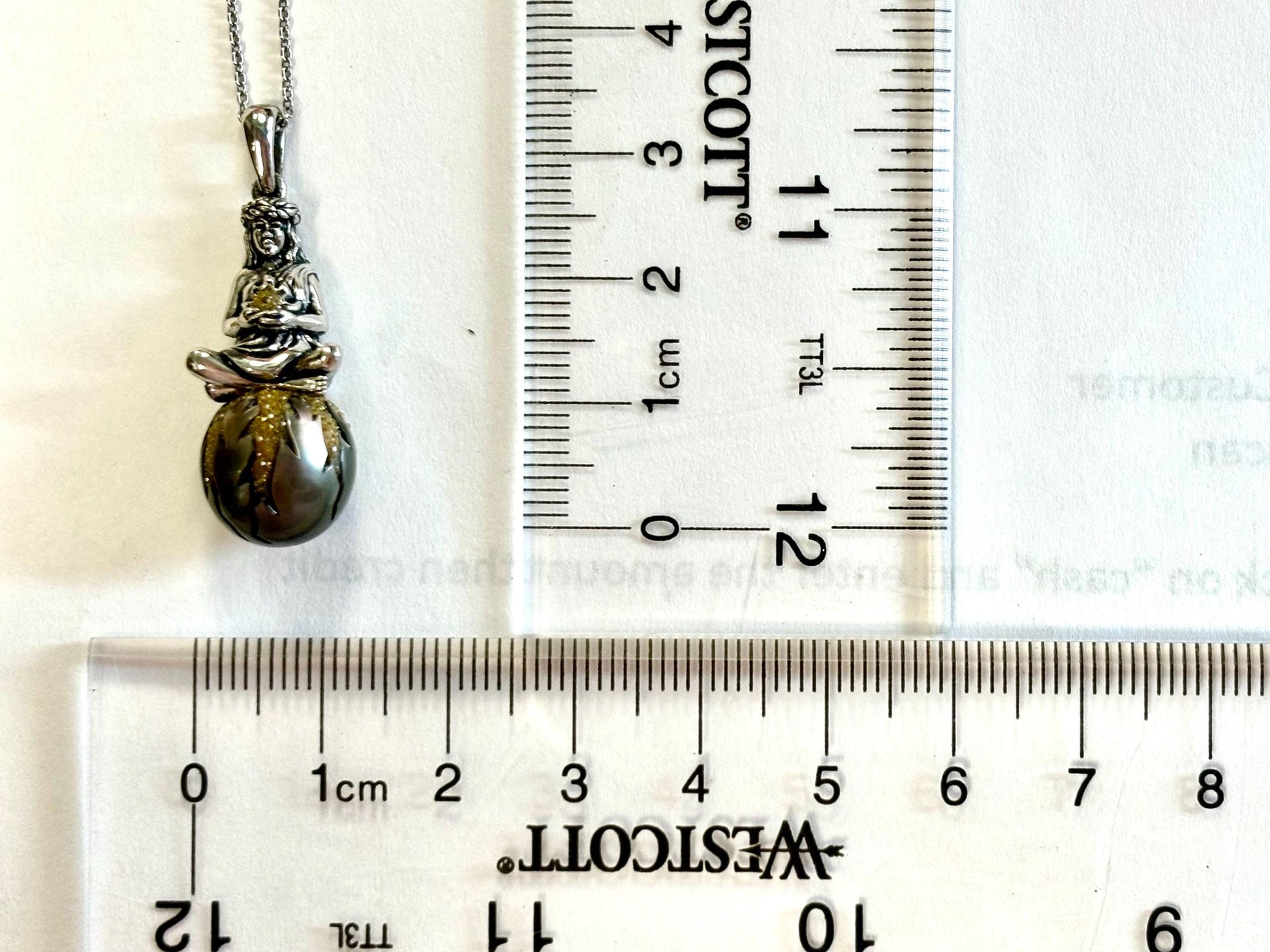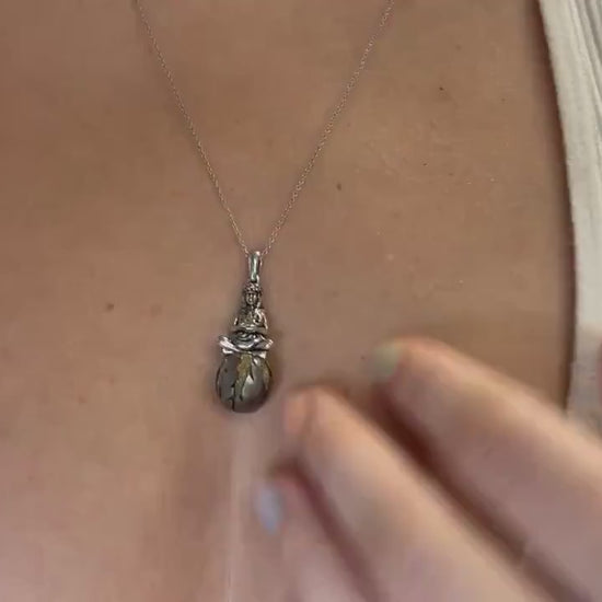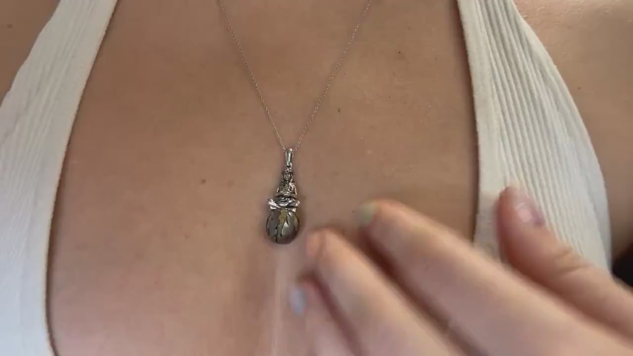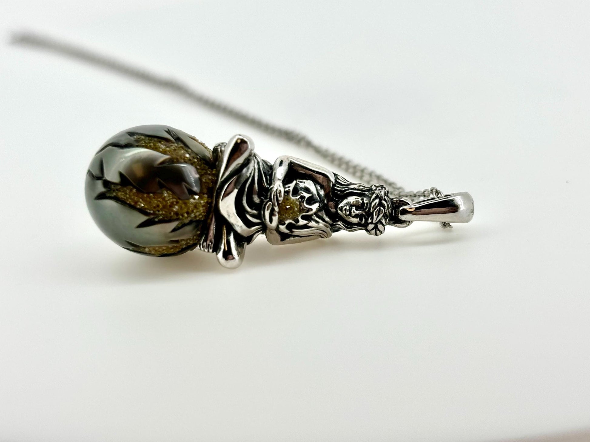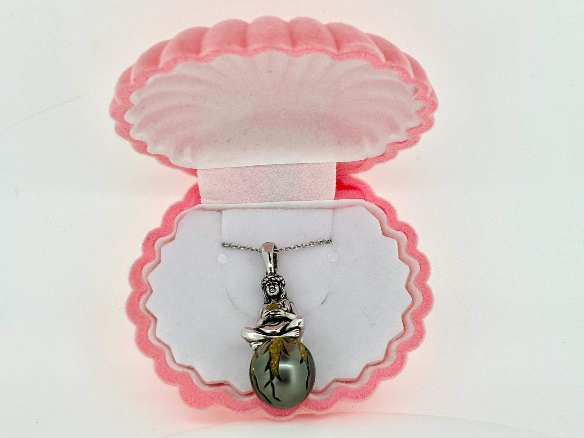 Pendant: This stunning piece is crafted from rhodium-plated 925 sterling silver to resist tarnishing and maintain its brilliant shine. It features Pele, the Volcano Goddess of Hawaii, gracefully seated atop a precious Black Tahitian Pearl. The pearl is hand-carved and inlaid with vibrant yellow diamonds, making this a truly one-of-a-kind creation.